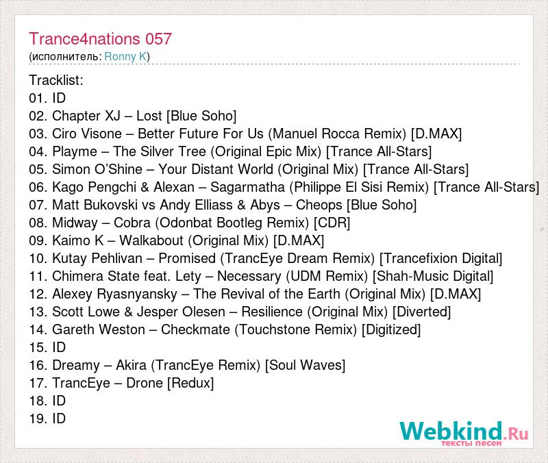 Tracklist: 01. ID 02. Chapter XJ – Lost [Blue Soho] 03. Ciro Visone – Better Future For Us (Manuel Rocca Remix) [D.MAX] 04. Playme – The Silver Tree (Original Epic Mix) [Trance All-Stars] 05. Simon O’Shine – Your Distant World (Original Mix) [Trance All-Stars] 06. Kago Pengchi & Alexan – Sagarmatha (Philippe El Sisi Remix) [Trance All-Stars] 07. Matt Bukovski vs Andy Elliass & Abys – Cheops [Blue Soho] 08. Midway – Cobra (Odonbat Bootleg Remix) [CDR] 09. Kaimo K – Walkabout (Original Mix) [D.MAX] 10. Kutay Pehlivan – Promised (TrancEye Dream Remix) [Trancefixion Digital] 11. Chimera State feat. Lety – Necessary (UDM Remix) [Shah-Music Digital] 12. Alexey Ryasnyansky – The Revival of the Earth (Original Mix) [D.MAX] 13. Scott Lowe & Jesper Olesen – Resilience (Original Mix) [Diverted] 14. Gareth Weston – Checkmate (Touchstone Remix) [Digitized] 15. ID 16. Dreamy – Akira (TrancEye Remix) [Soul Waves] 17. TrancEye – Drone [Redux] 18. ID 19. ID