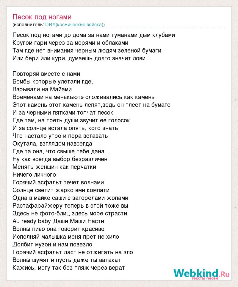 Песок под ногами до дома за нами туманами дым клубами Кругом гари через за морями и облаками Там где нет внимания черным людям зеленой бумаги Или бери или кури, думаешь долго значит лови Повторяй вместе с нами Бомбы которые улетали где, Взрывали на Майами Временами на менькьютэ сложивались как камень Этот камень этот камень лепят,ведь он тлеет на бумаге И за черными пятками топчат песок Где там, на треть души звучит ее голосок И за солнце встала опять, кого знать Что настало утро и пора вставать Окутала, взглядом навсегда Где та она, что свыше тебе дана Ну как всегда выбор безразличен Менять женщин как перчатки Ничего личного Горячий асфальт течет волнами Солнце светит жарко вмн компати Одна в майке саши с загорелами жопами Растафарайжеру теперь в этой тоже вы Здесь не фото-блиц здесь море страсти Au ready baby Даши Маши Насти Волны пиво она говорит красиво Исполняй малышка меня прет не хило Долбит музон и нам повезло Горячий асфальт даст не отжигать на зло Волны шумят и пусть даже ты ватакат Кажись, могу так без пляж через верат
