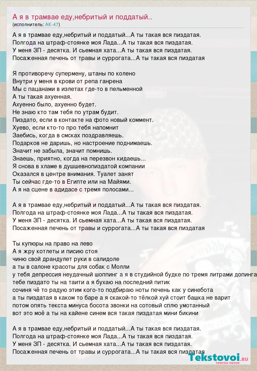 А я в трамвае еду,небритый и поддатый...А ты такая вся пиздатая. Полгода на штраф-стоянке моя Лада...А ты такая вся пиздатая. У меня ЗП - десятка. И сьемная хата...А ты такая вся пиздатая. Посаженная печень от травы и суррогата...А ты такая вся пиздатая Я противоречу супермену, штаны по колено Внутри у меня в крови от репа ганрена Мы с пацанами в излетах где-то в пельменной А ты такая ахуенная. Ахуенно было, ахуенно будет. Не знаю кто там тебя по утрам будит. Пиздато, если в контакте на фото новый коммент. Хуево, если кто-то про тебя напомнит Заебись, когда в смсках поздравляешь. Подарков не даришь, но настроение поднимаешь. Значит не забыла, значит помнишь. Знаешь, приятно, когда на перезвон кидаешь... Я снова в хламе в душшевнопиздатой компании Оказался в центре внимания. Туалет занят Ты сейчас где-то в Египте или на Майями. А я на сцене в адидасе с тремя полосами... А я в трамвае еду,небритый и поддатый...А ты такая вся пиздатая. Полгода на штраф-стоянке моя Лада...А ты такая вся пиздатая. У меня ЗП - десятка. И сьемная хата...А ты такая вся пиздатая. Посаженная печень от травы и суррогата...А ты такая вся пиздатая Ты купюры на право на лево А я жру котлеты и писию стоя чиню свой драндулет руки в салидоле а ты в салоне красоты для собак с Молли у тебя депрессия неудачный шоппинг а я в студийной будке по тремя литрами допинга тебе пиздато ты на таити а я бухаю на последний питик сочиня чё то радую этим кого-то подбираю ноты печень как у синебота а ты пиздатая в каком то баре а я скакой-то тёлкой хуй стоит башка не варит потом опять текста минуса босота звонки на сотовый сплю умотанный вот это моё а ты на кайене синем вся такая пиздатая мини бикини А я в трамвае еду,небритый и поддатый...А ты такая вся пиздатая. Полгода на штраф-стоянке моя Лада...А ты такая вся пиздатая. У меня ЗП - десятка. И сьемная хата...А ты такая вся пиздатая. Посаженная печень от травы и суррогата...А ты такая вся пиздатая
