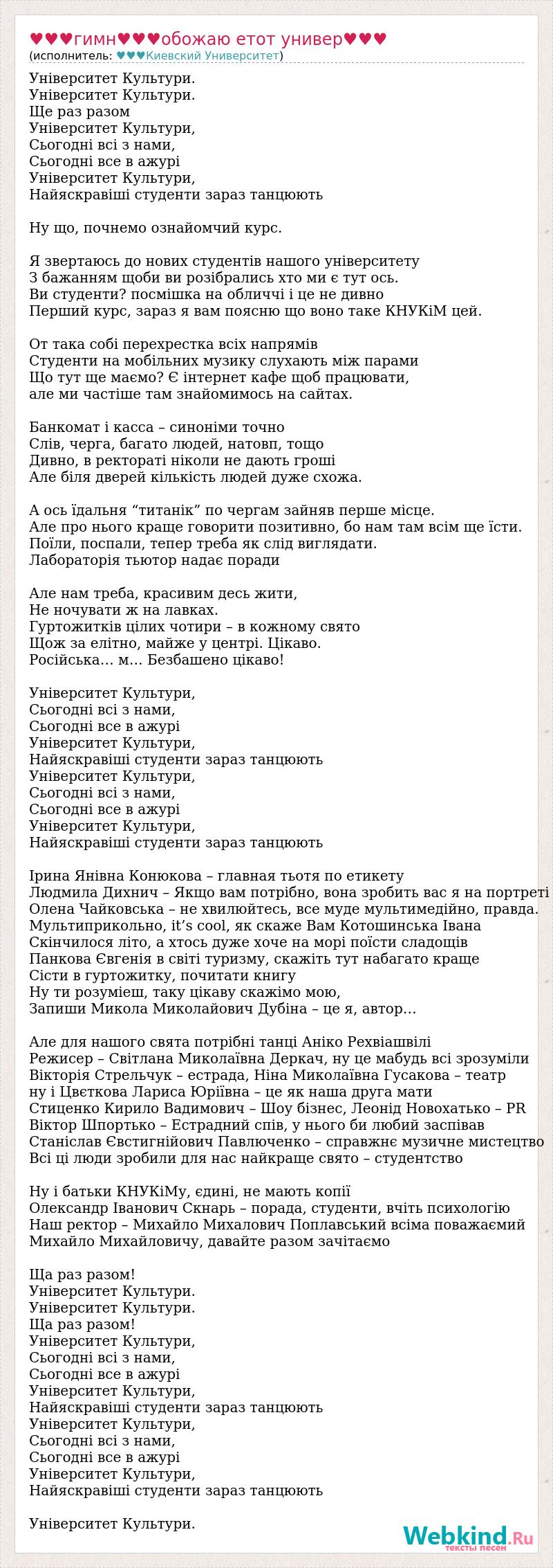 Університет Культури. Університет Культури. Ще раз разом Університет Культури, Сьогодні всі з нами, Сьогодні все в ажурі Університет Культури, Найяскравіші студенти зараз танцюють Ну що, почнемо ознайомчий курс. Я звертаюсь до нових студентів нашого університету З бажанням щоби ви розібрались хто ми є тут ось. Ви студенти? посмішка на обличчі і це не дивно Перший курс, зараз я вам поясню що воно таке КНУКіМ цей. От така собі перехрестка всіх напрямів Студенти на мобільних музику слухають між парами Що тут ще маємо? Є інтернет кафе щоб працювати, але ми частіше там знайомимось на сайтах. Банкомат і касса – синоніми точно Слів, черга, багато людей, натовп, тощо Дивно, в ректораті ніколи не дають гроші Але біля дверей кількість людей дуже схожа. А ось їдальня “титанік” по чергам зайняв перше місце. Але про нього краще говорити позитивно, бо нам там всім ще їсти. Поїли, поспали, тепер треба як слід виглядати. Лабораторія тьютор надає поради Але нам треба, красивим десь жити, Не ночувати ж на лавках. Гуртожитків цілих чотири – в кожному свято Щож за елітно, майже у центрі. Цікаво. Російська… м… Безбашено цікаво! Університет Культури, Сьогодні всі з нами, Сьогодні все в ажурі Університет Культури, Найяскравіші студенти зараз танцюють Університет Культури, Сьогодні всі з нами, Сьогодні все в ажурі Університет Культури, Найяскравіші студенти зараз танцюють Ірина Янівна Конюкова – главная тьотя по етикету Людмила Дихнич – Якщо вам потрібно, вона зробить вас я на портреті Олена Чайковська – не хвилюйтесь, все муде мультимедійно, правда. Мультиприкольно, it’s cool, як скаже Вам Котошинська Івана Скінчилося літо, а хтось дуже хоче на морі поїсти сладощів Панкова Євгенія в світі туризму, скажіть тут набагато краще Сісти в гуртожитку, почитати книгу Ну ти розуміеш, таку цікаву скажімо мою, Запиши Микола Миколайович Дубіна – це я, автор… Але для нашого свята потрібні танці Аніко Рехвіашвілі Режисер – Світлана Миколаївна Деркач, ну це мабудь всі зрозуміли Вікторія Стрельчук – естрада, Ніна Миколаївна Гусакова – театр ну і Цвєткова Лариса Юріївна – це як наша друга мати Стиценко Кирило Вадимович – Шоу бізнес, Леонід Новохатько – PR Віктор Шпортько – Естрадний спів, у нього би любий заспівав Станіслав Євстигнійович Павлюченко – справжнє музичне мистецтво Всі ці люди зробили для нас найкраще свято – студентство Ну і батьки КНУКіМу, єдині, не мають копії Олександр Іванович Скнарь – порада, студенти, вчіть психологію Наш ректор – Михайло Михалович Поплавський всіма поважаємий Михайло Михайловичу, давайте разом зачітаємо Ща раз разом! Університет Культури. Університет Культури. Ща раз разом! Університет Культури, Сьогодні всі з нами, Сьогодні все в ажурі Університет Культури, Найяскравіші студенти зараз танцюють Університет Культури, Сьогодні всі з нами, Сьогодні все в ажурі Університет Культури, Найяскравіші студенти зараз танцюють Університет Культури.