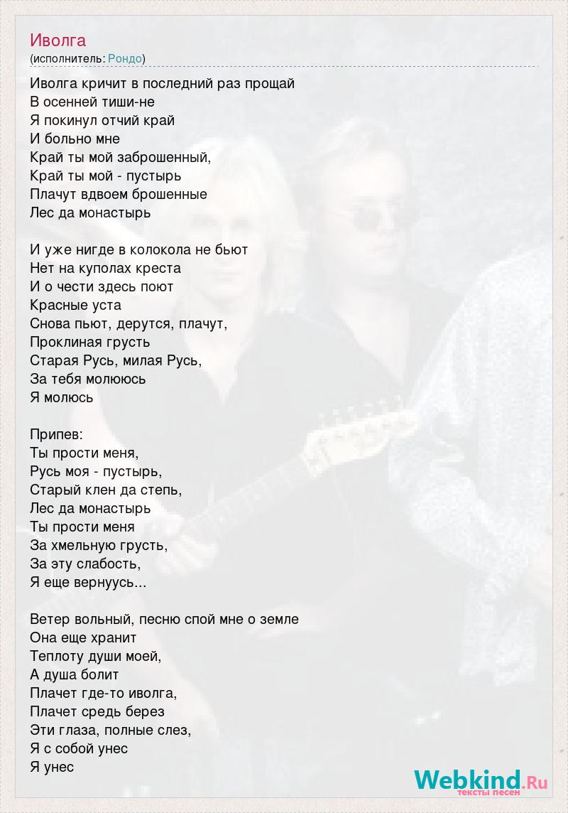Иволга кричит в последний раз прощай В осенней тиши-не Я покинул отчий край И больно мне Край ты мой заброшенный, Край ты мой - пустырь Плачут вдвоем брошенные Лес да монастырь И уже нигде в колокола не бьют Hет на куполах креста И о чести здесь поют Красные уста Снова пьют, дерутся, плачут, Проклиная грусть Старая Русь, милая Русь, За тебя молююсь Я молюсь Припев: Ты прости меня, Русь моя - пустырь, Старый клен да степь, Лес да монастырь Ты прости меня За хмельную грусть, За эту слабость, Я еще вернуусь... Ветер вольный, песню спой мне о земле Она еще хранит Теплоту души моей, А душа болит Плачет где-то иволга, Плачет средь берез Эти глаза, полные слез, Я с собой унес Я унес