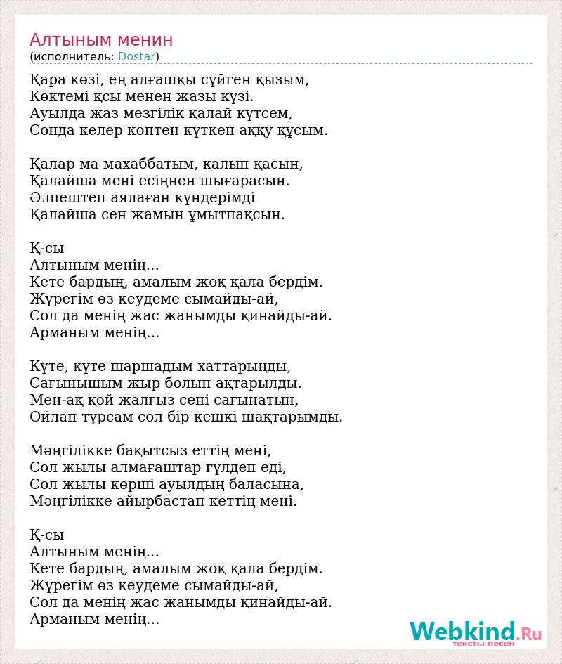 Қара көзі, ең алғашқы сүйген қызым, Көктемі қсы менен жазы күзі. Ауылда жаз мезгілік қалай күтсем, Сонда келер көптен күткен аққу құсым. Қалар ма махаббатым, қалып қасын, Қалайша мені есіңнен шығарасын. Әлпештеп аялаған күндерімді Қалайша сен жамын ұмытпақсын. Қ-сы Алтыным менің... Кете бардың, амалым жоқ қала бердім. Жүрегім өз кеудеме сымайды-ай, Сол да менің жас жанымды қинайды-ай. Арманым менің... Күте, күте шаршадым хаттарыңды, Сағынышым жыр болып ақтарылды. Мен-ақ қой жалғыз сені сағынатын, Ойлап тұрсам сол бір кешкі шақтарымды. Мәңгілікке бақытсыз еттің мені, Сол жылы алмағаштар гүлдеп еді, Сол жылы көрші ауылдың баласына, Мәңгілікке айырбастап кеттің мені. Қ-сы Алтыным менің... Кете бардың, амалым жоқ қала бердім. Жүрегім өз кеудеме сымайды-ай, Сол да менің жас жанымды қинайды-ай. Арманым менің...