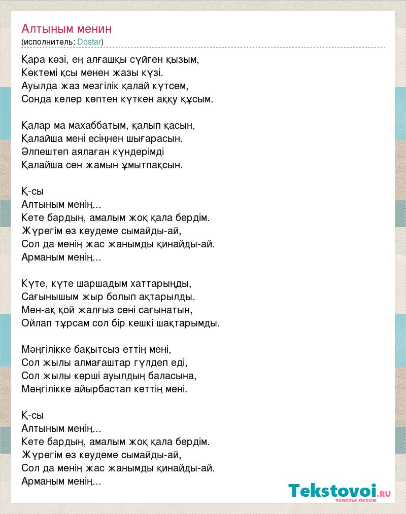 Қара көзі, ең алғашқы сүйген қызым, Көктемі қсы менен жазы күзі. Ауылда жаз мезгілік қалай күтсем, Сонда келер көптен күткен аққу құсым. Қалар ма махаббатым, қалып қасын, Қалайша мені есіңнен шығарасын. Әлпештеп аялаған күндерімді Қалайша сен жамын ұмытпақсын. Қ-сы Алтыным менің... Кете бардың, амалым жоқ қала бердім. Жүрегім өз кеудеме сымайды-ай, Сол да менің жас жанымды қинайды-ай. Арманым менің... Күте, күте шаршадым хаттарыңды, Сағынышым жыр болып ақтарылды. Мен-ақ қой жалғыз сені сағынатын, Ойлап тұрсам сол бір кешкі шақтарымды. Мәңгілікке бақытсыз еттің мені, Сол жылы алмағаштар гүлдеп еді, Сол жылы көрші ауылдың баласына, Мәңгілікке айырбастап кеттің мені. Қ-сы Алтыным менің... Кете бардың, амалым жоқ қала бердім. Жүрегім өз кеудеме сымайды-ай, Сол да менің жас жанымды қинайды-ай. Арманым менің...