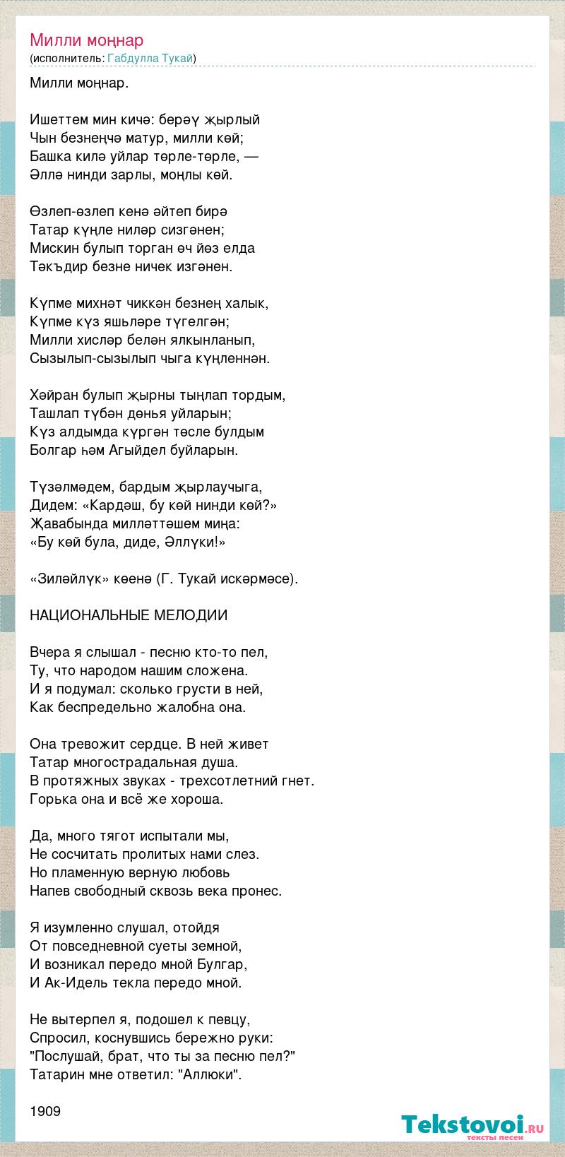 Милли моңнар. Ишеттем мин кичә: берәү җырлый Чын безнеңчә матур, милли көй; Башка килә уйлар төрле-төрле, — Әллә нинди зарлы, моңлы көй. Өзлеп-өзлеп кенә әйтеп бирә Татар күңле ниләр сизгәнен; Мискин булып торган өч йөз елда Тәкъдир безне ничек изгәнен. Күпме михнәт чиккән безнең халык, Күпме күз яшьләре түгелгән; Милли хисләр белән ялкынланып, Сызылып-сызылып чыга күңленнән. Хәйран булып җырны тыңлап тордым, Ташлап түбән дөнья уйларын; Күз алдымда күргән төсле булдым Болгар һәм Агыйдел буйларын. Түзәлмәдем, бардым җырлаучыга, Дидем: «Кардәш, бу көй нинди көй?» Җавабында милләттәшем миңа: «Бу көй була, диде, Әллүки!» «Зиләйлүк» көенә (Г. Тукай искәрмәсе). НАЦИОНАЛЬНЫЕ МЕЛОДИИ Вчера я слышал - песню кто-то пел, Ту, что народом нашим сложена. И я подумал: сколько грусти в ней, Как беспредельно жалобна она. Она тревожит сердце. В ней живет Татар многострадальная душа. В протяжных звуках - трехсотлетний гнет. Горька она и всё же хороша. Да, много тягот испытали мы, Не сосчитать пролитых нами слез. Но пламенную верную любовь Напев свободный сквозь века пронес. Я изумленно слушал, отойдя От повседневной суеты земной, И возникал передо мной Булгар, И Ак-Идель текла передо мной. Не вытерпел я, подошел к певцу, Спросил, коснувшись бережно руки: "Послушай, брат, что ты за песню пел?" Татарин мне ответил: "Аллюки". 1909
