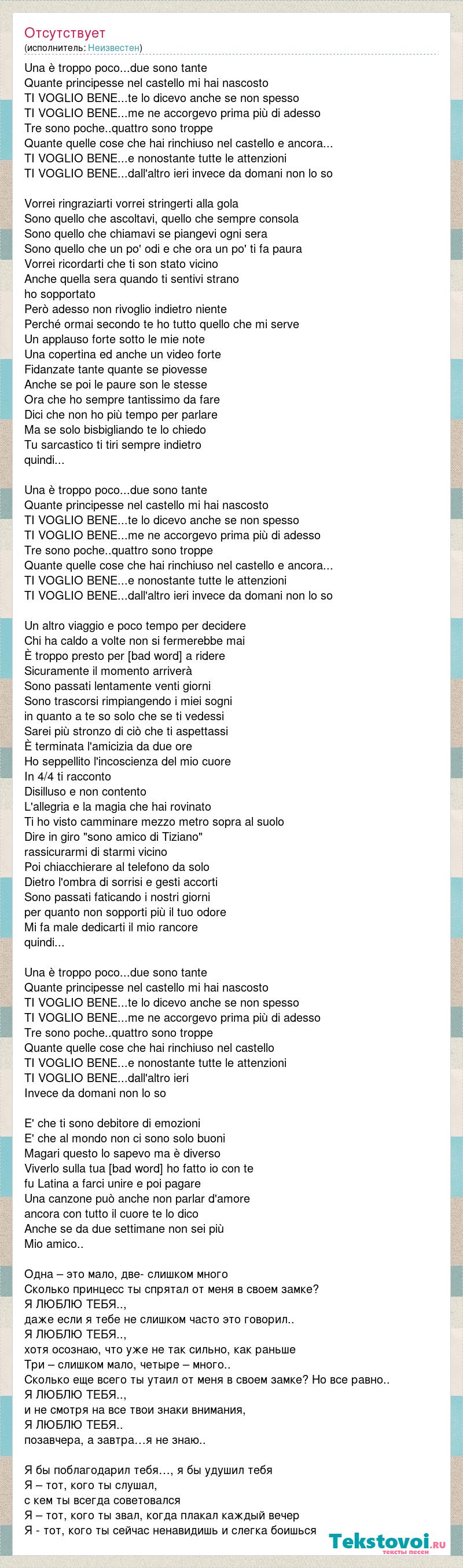 Una è troppo poco...due sono tante Quante principesse nel castello mi hai nascosto TI VOGLIO BENE...te lo dicevo anche se non spesso TI VOGLIO BENE...me ne accorgevo prima più di adesso Tre sono poche..quattro sono troppe Quante quelle cose che hai rinchiuso nel castello e ancora... TI VOGLIO BENE...e nonostante tutte le attenzioni TI VOGLIO BENE...dall'altro ieri invece da domani non lo so Vorrei ringraziarti vorrei stringerti alla gola Sono quello che ascoltavi, quello che sempre consola Sono quello che chiamavi se piangevi ogni sera Sono quello che un po' odi e che ora un po' ti fa paura Vorrei ricordarti che ti son stato vicino Anche quella sera quando ti sentivi strano ho sopportato Però adesso non rivoglio indietro niente Perché ormai secondo te ho tutto quello che mi serve Un applauso forte sotto le mie note Una copertina ed anche un video forte Fidanzate tante quante se piovesse Anche se poi le paure son le stesse Ora che ho sempre tantissimo da fare Dici che non ho più tempo per parlare Ma se solo bisbigliando te lo chiedo Tu sarcastico ti tiri sempre indietro quindi... Una è troppo poco...due sono tante Quante principesse nel castello mi hai nascosto TI VOGLIO BENE...te lo dicevo anche se non spesso TI VOGLIO BENE...me ne accorgevo prima più di adesso Tre sono poche..quattro sono troppe Quante quelle cose che hai rinchiuso nel castello e ancora... TI VOGLIO BENE...e nonostante tutte le attenzioni TI VOGLIO BENE...dall'altro ieri invece da domani non lo so Un altro viaggio e poco tempo per decidere Chi ha caldo a volte non si fermerebbe mai È troppo presto per ricominciare a ridere Sicuramente il momento arriverà Sono passati lentamente venti giorni Sono trascorsi rimpiangendo i miei sogni in quanto a te so solo che se ti vedessi Sarei più stronzo di ciò che ti aspettassi È terminata l'amicizia da due ore Ho seppellito l'incoscienza del mio cuore In 4/4 ti racconto Disilluso e non contento L'allegria e la magia che hai rovinato Ti ho visto camminare mezzo metro sopra al suolo Dire in giro "sono amico di Tiziano" rassicurarmi di starmi vicino Poi chiacchierare al telefono da solo Dietro l'ombra di sorrisi e gesti accorti Sono passati faticando i nostri giorni per quanto non sopporti più il tuo odore Mi fa male dedicarti il mio rancore quindi... Una è troppo poco...due sono tante Quante principesse nel castello mi hai nascosto TI VOGLIO BENE...te lo dicevo anche se non spesso TI VOGLIO BENE...me ne accorgevo prima più di adesso Tre sono poche..quattro sono troppe Quante quelle cose che hai rinchiuso nel castello TI VOGLIO BENE...e nonostante tutte le attenzioni TI VOGLIO BENE...dall'altro ieri Invece da domani non lo so E' che ti sono debitore di emozioni E' che al mondo non ci sono solo buoni Magari questo lo sapevo ma è diverso Viverlo sulla tua pelle come ho fatto io con te fu Latina a farci unire e poi pagare Una canzone può anche non parlar d'amore ancora con tutto il cuore te lo dico Anche se da due settimane non sei più Mio amico.. Одна – это мало, две- слишком много Сколько принцесс ты спрятал от меня в своем замке? Я ЛЮБЛЮ ТЕБЯ.., даже если я тебе не слишком часто это говорил.. Я ЛЮБЛЮ ТЕБЯ.., хотя осознаю, что уже не так сильно, как раньше Три – слишком мало, четыре – много.. Сколько еще всего ты утаил от меня в своем замке? Но все равно.. Я ЛЮБЛЮ ТЕБЯ.., и не смотря на все твои знаки внимания, Я ЛЮБЛЮ ТЕБЯ.. позавчера, а завтра…я не знаю.. Я бы поблагодарил тебя…, я бы удушил тебя Я – тот, кого ты слушал, с кем ты всегда советовался Я – тот, кого ты звал, когда плакал каждый вечер Я - тот, кого ты сейчас ненавидишь и слегка боишься