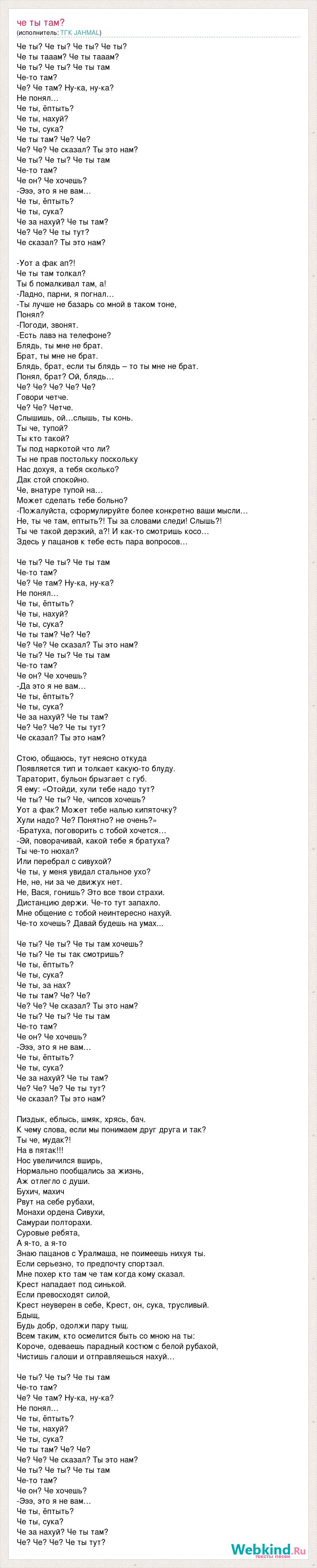 Че ты? Че ты? Че ты? Че ты? Че ты тааам? Че ты тааам? Че ты? Че ты? Че ты там Че-то там? Че? Че там? Ну-ка, ну-ка? Не понял… Че ты, ёптыть? Че ты, нахуй? Че ты, сука? Че ты там? Че? Че? Че? Че? Че сказал? Ты это нам? Че ты? Че ты? Че ты там Че-то там? Че он? Че хочешь? -Эээ, это я не вам… Че ты, ёптыть? Че ты, сука? Че за нахуй? Че ты там? Че? Че? Че ты тут? Че сказал? Ты это нам? -Уот а фак ап?! Че ты там толкал? Ты б помалкивал там, а! -Ладно, парни, я погнал… -Ты лучше не базарь со мной в таком тоне, Понял? -Погоди, звонят. -Есть лавэ на телефоне? Блядь, ты мне не брат. Брат, ты мне не брат. Блядь, брат, если ты блядь – то ты мне не брат. Понял, брат? Ой, блядь… Че? Че? Че? Че? Че? Говори четче. Че? Че? Четче. Слышишь, ой…слышь, ты конь. Ты че, тупой? Ты кто такой? Ты под наркотой что ли? Ты не прав постольку поскольку Нас дохуя, а тебя сколько? Дак стой спокойно. Че, внатуре тупой на… Может сделать тебе больно? -Пожалуйста, сформулируйте более конкретно ваши мысли… Не, ты че там, ептыть?! Ты за словами следи! Слышь?! Ты че такой дерзкий, а?! И как-то смотришь косо… Здесь у пацанов к тебе есть пара вопросов… Че ты? Че ты? Че ты там Че-то там? Че? Че там? Ну-ка, ну-ка? Не понял… Че ты, ёптыть? Че ты, нахуй? Че ты, сука? Че ты там? Че? Че? Че? Че? Че сказал? Ты это нам? Че ты? Че ты? Че ты там Че-то там? Че он? Че хочешь? -Да это я не вам… Че ты, ёптыть? Че ты, сука? Че за нахуй? Че ты там? Че? Че? Че? Че ты тут? Че сказал? Ты это нам? Стою, общаюсь, тут неясно откуда Появляется тип и толкает какую-то блуду. Тараторит, бульон брызгает с губ. Я ему: «Отойди, хули тебе надо тут? Че ты? Че ты? Че, чипсов хочешь? Уот а фак? Может тебе налью кипяточку? Хули надо? Че? Понятно? не очень?» -Братуха, поговорить с тобой хочется… -Эй, поворачивай, какой тебе я братуха? Ты че-то нюхал? Или перебрал с сивухой? Че ты, у меня увидал стальное ухо? Не, не, ни за че движух нет. Не, Вася, гонишь? Это все твои страхи. Дистанцию держи. Че-то тут запахло. Мне общение с тобой неинтересно нахуй. Че-то хочешь? Давай будешь на умах... Че ты? Че ты? Че ты там хочешь? Че ты? Че ты так смотришь? Че ты, ёптыть? Че ты, сука? Че ты, за нах? Че ты там? Че? Че? Че? Че? Че сказал? Ты это нам? Че ты? Че ты? Че ты там Че-то там? Че он? Че хочешь? -Эээ, это я не вам… Че ты, ёптыть? Че ты, сука? Че за нахуй? Че ты там? Че? Че? Че? Че ты тут? Че сказал? Ты это нам? Пиздык, еблысь, шмяк, хрясь, бач. К чему слова, если мы понимаем друг друга и так? Ты че, мудак?! На в пятак!!! Нос увеличился вширь, Нормально пообщались за жизнь, Аж отлегло с души. Бухич, махич Рвут на себе рубахи, Монахи ордена Сивухи, Самураи полторахи. Суровые ребята, А я-то, а я-то Знаю пацанов с Уралмаша, не поимеешь нихуя ты. Если серьезно, то предпочту спортзал. Мне похер кто там че там когда кому сказал. Крест нападает под синькой. Если превосходят силой, Крест неуверен в себе, Крест, он, сука, трусливый. Бдыщ, Будь добр, одолжи пару тыщ. Всем таким, кто осмелится быть со мною на ты: Короче, одеваешь парадный костюм с белой рубахой, Чистишь галоши и отправляешься нахуй… Че ты? Че ты? Че ты там Че-то там? Че? Че там? Ну-ка, ну-ка? Не понял… Че ты, ёптыть? Че ты, нахуй? Че ты, сука? Че ты там? Че? Че? Че? Че? Че сказал? Ты это нам? Че ты? Че ты? Че ты там Че-то там? Че он? Че хочешь? -Эээ, это я не вам… Че ты, ёптыть? Че ты, сука? Че за нахуй? Че ты там? Че? Че? Че? Че ты тут?