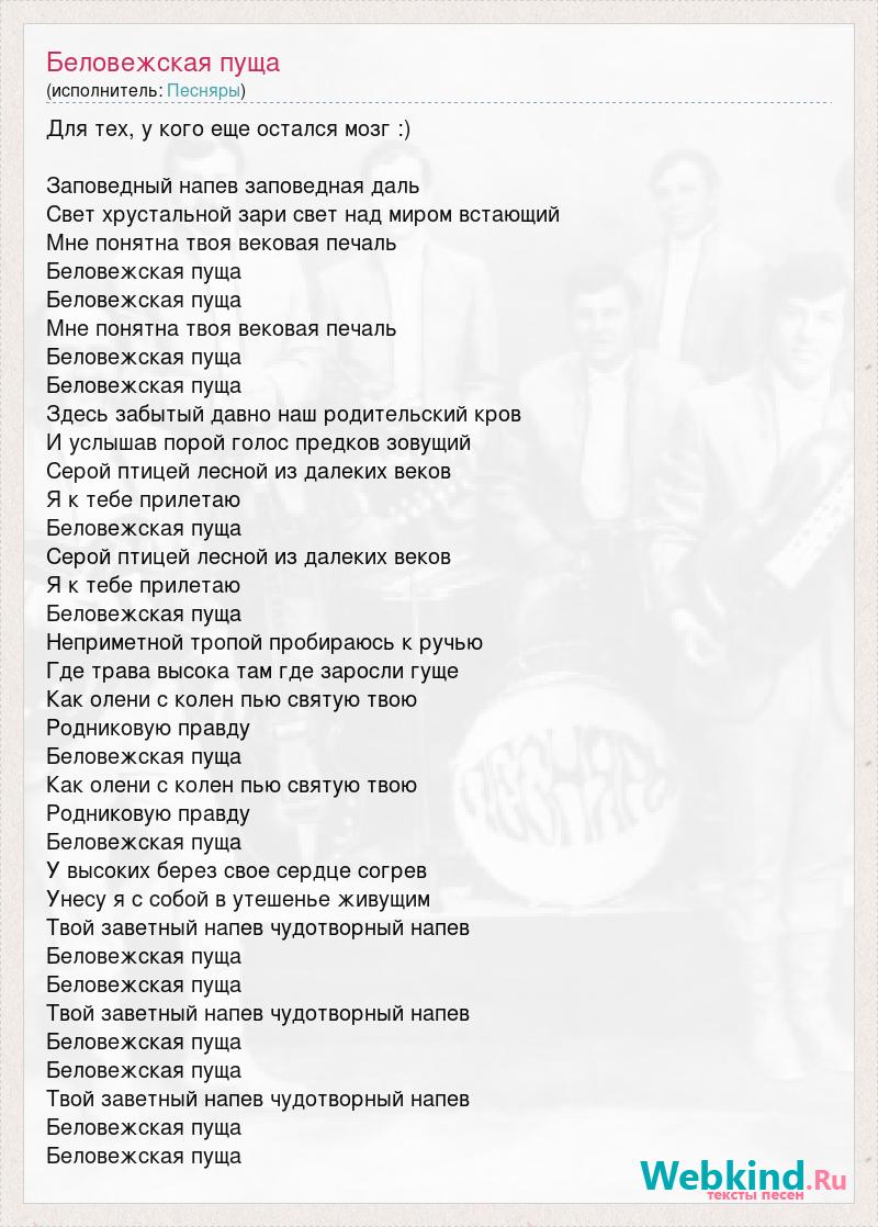Для тех, у кого еще остался мозг :) Заповедный напев заповедная даль Свет хрустальной зари свет над миром встающий Мне понятна твоя вековая печаль Беловежская пуща Беловежская пуща Мне понятна твоя вековая печаль Беловежская пуща Беловежская пуща Здесь забытый давно наш родительский кров И услышав порой голос предков зовущий Серой птицей лесной из далеких веков Я к тебе прилетаю Беловежская пуща Серой птицей лесной из далеких веков Я к тебе прилетаю Беловежская пуща Неприметной тропой пробираюсь к ручью Где трава высока там где заросли гуще Как олени с колен пью святую твою Родниковую правду Беловежская пуща Как олени с колен пью святую твою Родниковую правду Беловежская пуща У высоких берез свое сердце согрев Унесу я с собой в утешенье живущим Твой заветный напев чудотворный напев Беловежская пуща Беловежская пуща Твой заветный напев чудотворный напев Беловежская пуща Беловежская пуща Твой заветный напев чудотворный напев Беловежская пуща Беловежская пуща