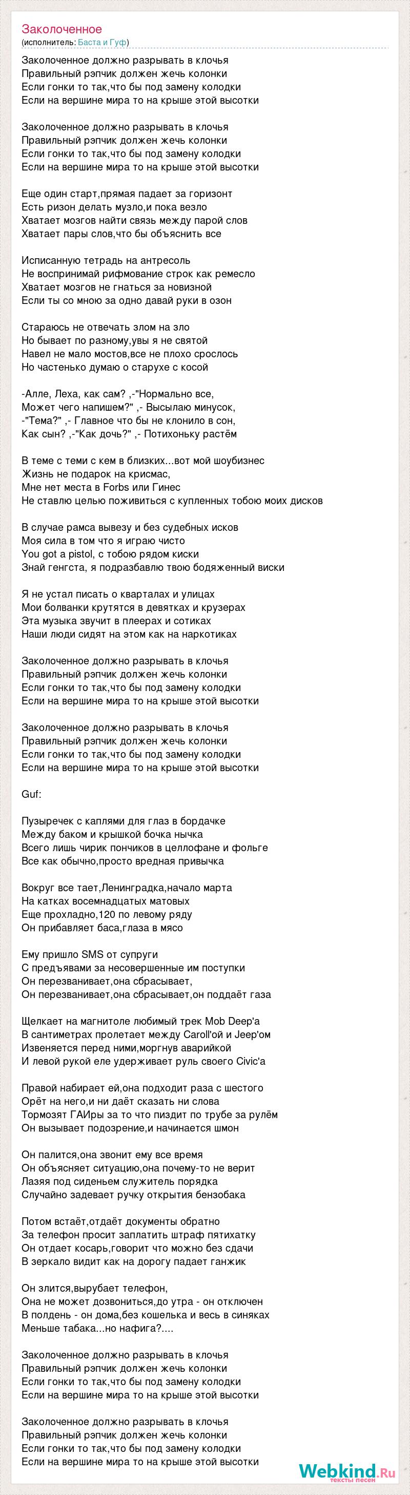 Заколоченное должно разрывать в клочья Правильный рэпчик должен жечь колонки Если гонки то так,что бы под замену колодки Если на вершине мира то на крыше этой высотки Заколоченное должно разрывать в клочья Правильный рэпчик должен жечь колонки Если гонки то так,что бы под замену колодки Если на вершине мира то на крыше этой высотки Еще один старт,прямая падает за горизонт Есть ризон делать музло,и пока везло Хватает мозгов найти связь между парой слов Хватает пары слов,что бы объяснить все Исписанную тетрадь на антресоль Не воспринимай рифмование строк как ремесло Хватает мозгов не гнаться за новизной Если ты со мною за одно давай руки в озон Стараюсь не отвечать злом на зло Но бывает по разному,увы я не святой Навел не мало мостов,все не плохо срослось Но частенько думаю о старухе с косой -Алле, Леха, как сам? ,-"Нормально все, Может чего напишем?" ,- Высылаю минусок, -"Тема?" ,- Главное что бы не клонило в сон, Как сын? ,-"Как дочь?" ,- Потихоньку растём В теме с теми с кем в близких...вот мой шоубизнес Жизнь не подарок на крисмас, Мне нет места в Forbs или Гинес Не ставлю целью поживиться с купленных тобою моих дисков В случае рамса вывезу и без судебных исков Моя сила в том что я играю чисто You got a pistol, с тобою рядом киски Знай генгста, я подразбавлю твою бодяженный виски Я не устал писать о кварталах и улицах Мои болванки крутятся в девятках и крузерах Эта музыка звучит в плеерах и сотиках Наши люди сидят на этом как на наркотиках Заколоченное должно разрывать в клочья Правильный рэпчик должен жечь колонки Если гонки то так,что бы под замену колодки Если на вершине мира то на крыше этой высотки Заколоченное должно разрывать в клочья Правильный рэпчик должен жечь колонки Если гонки то так,что бы под замену колодки Если на вершине мира то на крыше этой высотки Guf: Пузыречек с каплями для глаз в бордачке Между баком и крышкой бочка нычка Всего лишь чирик пончиков в целлофане и фольге Все как обычно,просто вредная привычка Вокруг все тает,Ленинградка,начало марта На катках восемнадцатых матовых Еще прохладно,120 по левому ряду Он прибавляет баса,глаза в мясо Ему пришло SMS от супруги С предъявами за несовершенные им поступки Он перезванивает,она сбрасывает, Он перезванивает,она сбрасывает,он поддаёт газа Щелкает на магнитоле любимый трек Mob Deep'a В сантиметрах пролетает между Caroll'ой и Jeep'ом Извеняется перед ними,моргнув аварийкой И левой рукой еле удерживает руль своего Civic'а Правой набирает ей,она подходит раза с шестого Орёт на него,и ни даёт сказать ни слова Тормозят ГАИры за то что пиздит по трубе за рулём Он вызывает подозрение,и начинается шмон Он палится,она звонит ему все время Он объясняет ситуацию,она почему-то не верит Лазяя под сиденьем служитель порядка Случайно задевает ручку открытия бензобака Потом встаёт,отдаёт документы обратно За телефон просит заплатить штраф пятихатку Он отдает косарь,говорит что можно без сдачи В зеркало видит как на дорогу падает ганжик Он злится,вырубает телефон, Она не может дозвониться,до утра - он отключен В полдень - он дома,без кошелька и весь в синяках Меньше табака...но нафига?.... Заколоченное должно разрывать в клочья Правильный рэпчик должен жечь колонки Если гонки то так,что бы под замену колодки Если на вершине мира то на крыше этой высотки Заколоченное должно разрывать в клочья Правильный рэпчик долже