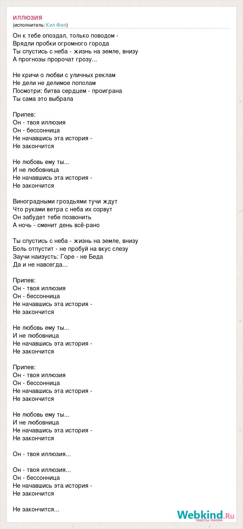 Он к тебе опоздал, только поводом - Врядли пробки огромного города Ты спустись с неба - жизнь на земле, внизу А прогнозы пророчат грозу... Не кричи о любви с уличных реклам Не дели не делимое пополам Посмотри: битва сердцем - проиграна Ты сама это выбрала Припев: Он - твоя иллюзия Он - бессонница Не начавшись эта история - Не закончится Не любовь ему ты... И не любовница Не начавшись эта история - Не закончится Виноградными гроздьями тучи ждут Что руками ветра с неба их сорвут Он забудет тебе позвонить А ночь - сменит день всё-рано Ты спустись с неба - жизнь на земле, внизу Боль отпустит - не пробуй на вкус слезу Заучи наизусть: Горе - не Беда Да и не навсегда... Припев: Он - твоя иллюзия Он - бессонница Не начавшись эта история - Не закончится Не любовь ему ты... И не любовница Не начавшись эта история - Не закончится Припев: Он - твоя иллюзия Он - бессонница Не начавшись эта история - Не закончится Не любовь ему ты... И не любовница Не начавшись эта история - Не закончится Он - твоя иллюзия... Он - твоя иллюзия... Он - бессонница Не начавшись эта история - Не закончится Не закончится...