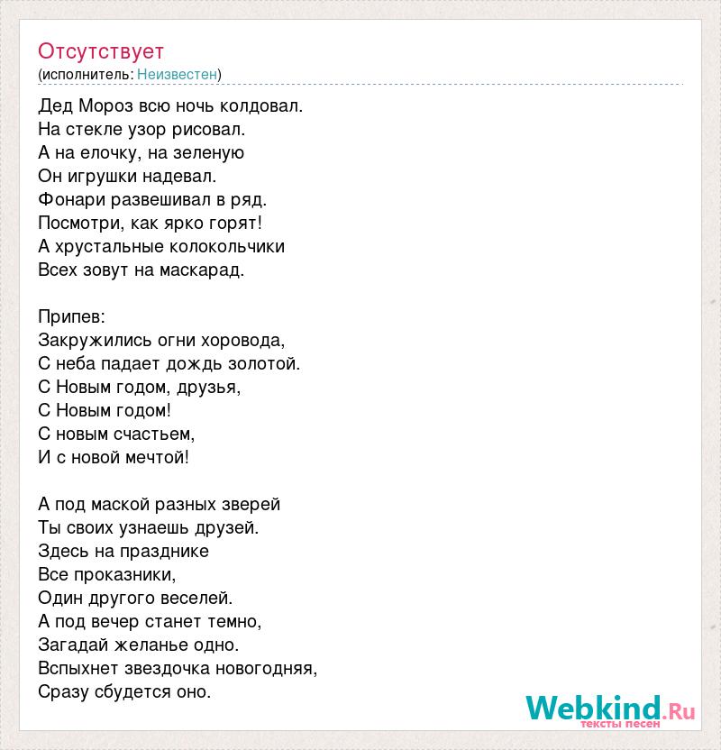 Дед Мороз всю ночь колдовал. На стекле узор рисовал. А на елочку, на зеленую Он игрушки надевал. Фонари развешивал в ряд. Посмотри, как ярко горят! А хрустальные колокольчики Всех зовут на маскарад. Припев: Закружились огни хоровода, С неба падает дождь золотой. С Новым годом, друзья, С Новым годом! С новым счастьем, И с новой мечтой! А под маской разных зверей Ты своих узнаешь друзей. Здесь на празднике Все проказники, Один другого веселей. А под вечер станет темно, Загадай желанье одно. Вспыхнет звездочка новогодняя, Сразу сбудется оно.