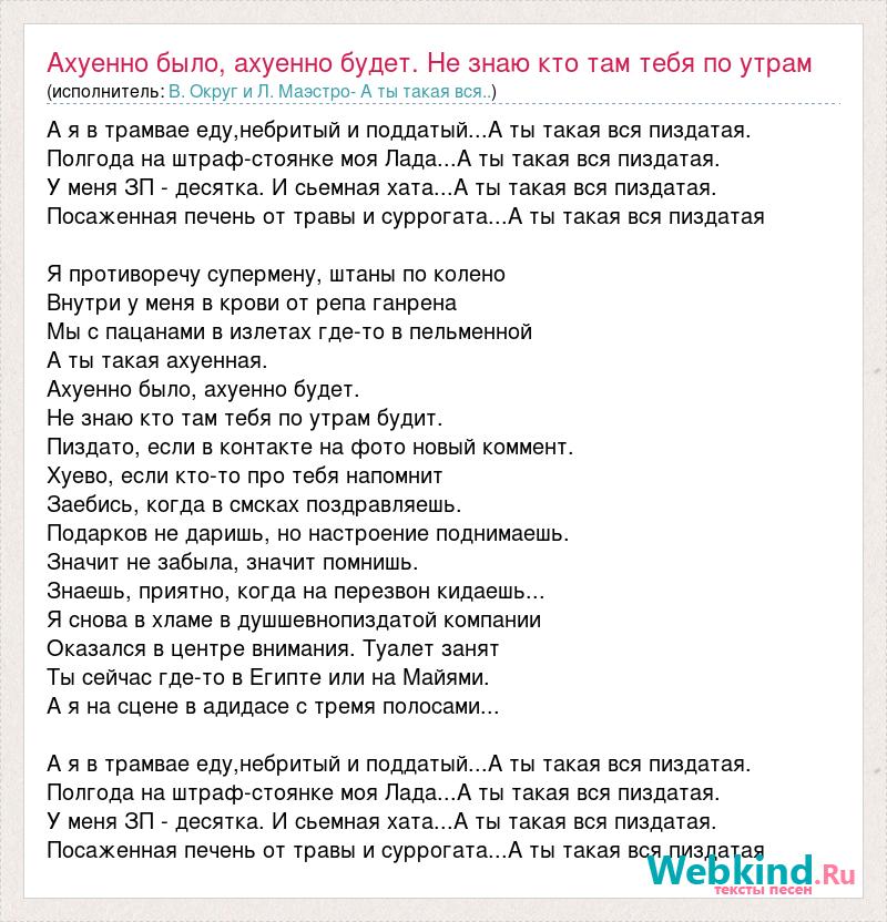 А я в трамвае еду,небритый и поддатый...А ты такая вся пиздатая. Полгода на штраф-стоянке моя Лада...А ты такая вся пиздатая. У меня ЗП - десятка. И сьемная хата...А ты такая вся пиздатая. Посаженная печень от травы и суррогата...А ты такая вся пиздатая Я противоречу супермену, штаны по колено Внутри у меня в крови от репа ганрена Мы с пацанами в излетах где-то в пельменной А ты такая ахуенная. Ахуенно было, ахуенно будет. Не знаю кто там тебя по утрам будит. Пиздато, если в контакте на фото новый коммент. Хуево, если кто-то про тебя напомнит Заебись, когда в смсках поздравляешь. Подарков не даришь, но настроение поднимаешь. Значит не забыла, значит помнишь. Знаешь, приятно, когда на перезвон кидаешь... Я снова в хламе в душшевнопиздатой компании Оказался в центре внимания. Туалет занят Ты сейчас где-то в Египте или на Майями. А я на сцене в адидасе с тремя полосами... А я в трамвае еду,небритый и поддатый...А ты такая вся пиздатая. Полгода на штраф-стоянке моя Лада...А ты такая вся пиздатая. У меня ЗП - десятка. И сьемная хата...А ты такая вся пиздатая. Посаженная печень от травы и суррогата...А ты такая вся пиздатая