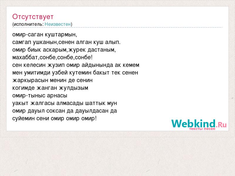 омир-саган куштармын, самгап ушканын,сенен алган куш алып. омир биык аскарым,журек дастаным, махаббат,сонбе,сонбе,сонбе! сен келесин жузип омир айдынында ак кемем мен умитимди узбей кутемин бакыт тек сенен жаркырасын менин де сенин когимде жанган жулдызым омир-тыныс арнасы уакыт жалгасы алмасады шаттык мун омир дауыл соксан да дауылдасан да суйемин сени омир омир омир!