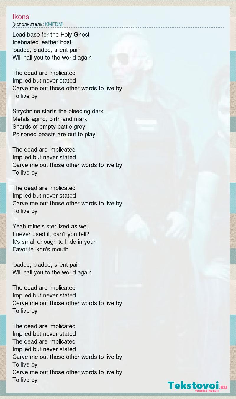Lead base for the Holy Ghost Inebriated leather host loaded, bladed, silent pain Will nail you to the world again The dead are implicated Implied but never stated Carve me out those other words to live by To live by Strychnine starts the bleeding dark Metals aging, birth and mark Shards of empty battle grey Poisoned beasts are out to play The dead are implicated Implied but never stated Carve me out those other words to live by To live by The dead are implicated Implied but never stated Carve me out those other words to live by To live by Yeah mine's sterilized as well I never used it, can't you tell? It's small enough to hide in your Favorite ikon's mouth loaded, bladed, silent pain Will nail you to the world again The dead are implicated Implied but never stated Carve me out those other words to live by To live by The dead are implicated Implied but never stated The dead are implicated Implied but never stated Carve me out those other words to live by To live by Carve me out those other words to live by To live by
