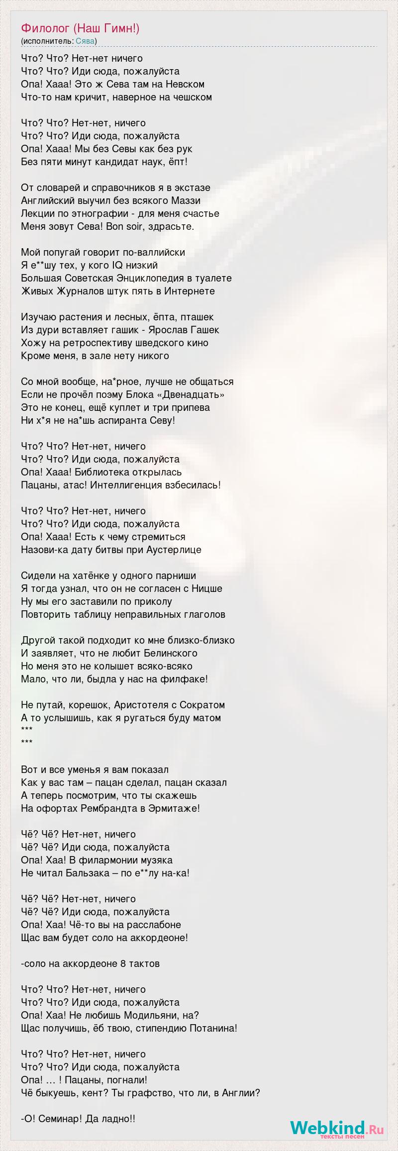 Что? Что? Нет-нет ничего Что? Что? Иди сюда, пожалуйста Опа! Хааа! Это ж Сева там на Невском Что-то нам кричит, наверное на чешском Что? Что? Нет-нет, ничего Что? Что? Иди сюда, пожалуйста Опа! Хааа! Мы без Севы как без рук Без пяти минут кандидат наук, ёпт! От словарей и справочников я в экстазе Английский выучил без всякого Маззи Лекции по этнографии - для меня счастье Меня зовут Сева! Bon soir, здрасьте. Мой попугай говорит по-валлийски Я е**шу тех, у кого IQ низкий Большая Советская Энциклопедия в туалете Живых Журналов штук пять в Интернете Изучаю растения и лесных, ёпта, пташек Из дури вставляет гашик - Ярослав Гашек Хожу на ретроспективу шведского кино Кроме меня, в зале нету никого Со мной вообще, на*рное, лучше не общаться Если не прочёл поэму Блока «Двенадцать» Это не конец, ещё куплет и три припева Ни х*я не на*шь аспиранта Севу! Что? Что? Нет-нет, ничего Что? Что? Иди сюда, пожалуйста Опа! Хааа! Библиотека открылась Пацаны, атас! Интеллигенция взбесилась! Что? Что? Нет-нет, ничего Что? Что? Иди сюда, пожалуйста Опа! Хааа! Есть к чему стремиться Назови-ка дату битвы при Аустерлице Сидели на хатёнке у одного парниши Я тогда узнал, что он не согласен с Ницше Ну мы его заставили по приколу Повторить таблицу неправильных глаголов Другой такой подходит ко мне близко-близко И заявляет, что не любит Белинского Но меня это не колышет всяко-всяко Мало, что ли, быдла у нас на филфаке! Не путай, корешок, Аристотеля с Сократом А то услышишь, как я ругаться буду матом *** *** Вот и все уменья я вам показал Как у вас там – пацан сделал, пацан сказал А теперь посмотрим, что ты скажешь На офортах Рембрандта в Эрмитаже! Чё? Чё? Нет-нет, ничего Чё? Чё? Иди сюда, пожалуйста Опа! Хаа! В филармонии музяка Не читал Бальзака – по е**лу на-ка! Чё? Чё? Нет-нет, ничего Чё? Чё? Иди сюда, пожалуйста Опа! Хаа! Чё-то вы на расслабоне Щас вам будет соло на аккордеоне! -соло на аккордеоне 8 тактов Что? Что? Нет-нет, ничего Что? Что? Иди сюда, пожалуйста Опа! Хаа! Не любишь Модильяни, на? Щас получишь, ёб твою, стипендию Потанина! Что? Что? Нет-нет, ничего Что? Что? Иди сюда, пожалуйста Опа! … ! Пацаны, погнали! Чё быкуешь, кент? Ты графство, что ли, в Англии? -О! Семинар! Да ладно!!