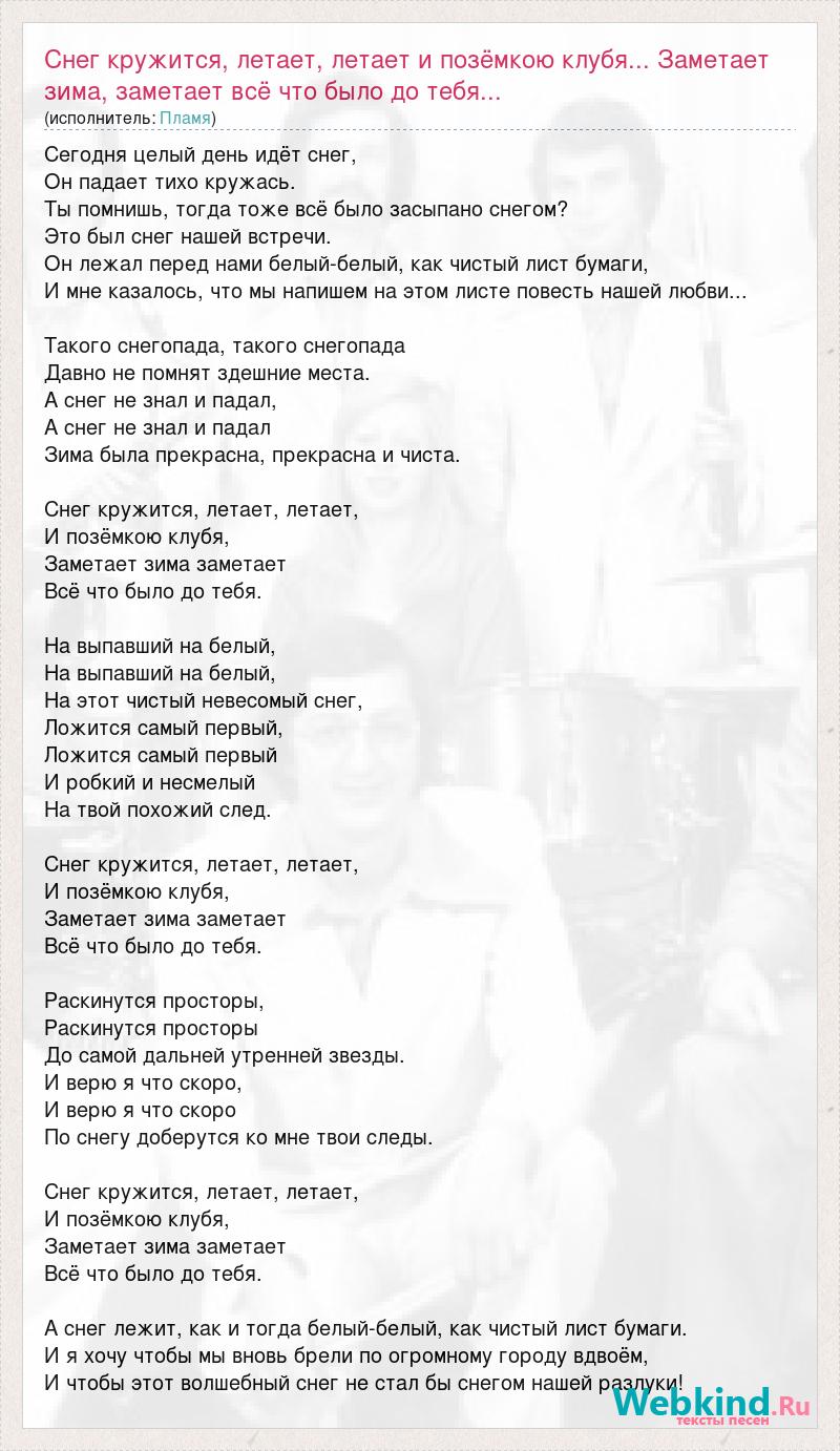 Сегодня целый день идёт снег, Он падает тихо кружась. Ты помнишь, тогда тоже всё было засыпано снегом? Это был снег нашей встречи. Он лежал перед нами белый-белый, как чистый лист бумаги, И мне казалось, что мы напишем на этом листе повесть нашей любви... Такого снегопада, такого снегопада Давно не помнят здешние места. А снег не знал и падал, А снег не знал и падал Зима была прекрасна, прекрасна и чиста. Снег кружится, летает, летает, И позёмкою клубя, Заметает зима заметает Всё что было до тебя. На выпавший на белый, На выпавший на белый, На этот чистый невесомый снег, Ложится самый первый, Ложится самый первый И робкий и несмелый На твой похожий след. Снег кружится, летает, летает, И позёмкою клубя, Заметает зима заметает Всё что было до тебя. Раскинутся просторы, Раскинутся просторы До самой дальней утренней звезды. И верю я что скоро, И верю я что скоро По снегу доберутся ко мне твои следы. Снег кружится, летает, летает, И позёмкою клубя, Заметает зима заметает Всё что было до тебя. А снег лежит, как и тогда белый-белый, как чистый лист бумаги. И я хочу чтобы мы вновь брели по огромному городу вдвоём, И чтобы этот волшебный снег не стал бы снегом нашей разлуки!