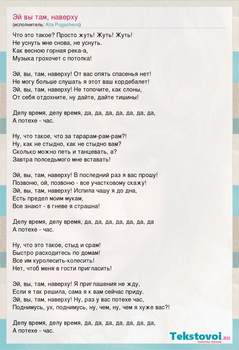 Что это такое? Просто жуть! Жуть! Жуть! Не уснуть мне снова, не уснуть. Как весною горная река-а, Музыка грохочет с потолка! Эй, вы, там, наверху! От вас опять спасенья нет! Не могу больше слушать я этот ваш кордебалет! Эй, вы, там, наверху! Не топочите, как слоны, От себя отдохните, ну дайте, дайте тишины! Делу время, делу время, да, да, да, да, да, да, да, А потехе - час. Ну, что такое, что за тарарам-рам-рам?! Ну, как не стыдно, как не стыдно вам? Сколько можно петь и танцевать, а? Завтра полседьмого мне вставать! Эй, вы, там, наверху! В последний раз я вас прошу! Позвоню, ой, позвоню - все участковому скажу! Эй, вы, там, наверху! Испила чашу я до дна, Есть предел моим мукам, Все знают - в гневе я страшна! Делу время, делу время, да, да, да, да, да, да, да А потехе - час. Ну, что это такое, стыд и срам! Быстро расходитесь по домам! Все им куролесить-колесить! Нет, чтоб меня в гости пригласить! Эй, вы, там, наверху! Я приглашения не жду, Если я так решила, сама я к вам сейчас приду. Эй, вы, там, наверху! Ну, раз у вас потехе час, Поднимусь, ух, поднимусь, ну, чем, ну, чем я хуже вас?! Делу время, делу время, да, да, да, да, да, да, да, А потехе - час.