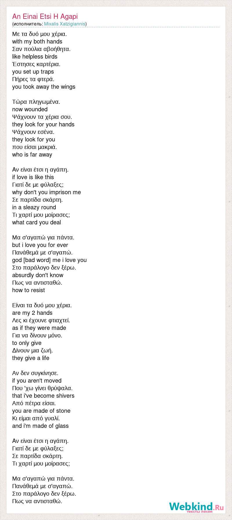 Με τα δυό μου χέρια. with my both hands Σαν πούλια αβοήθητα. like helpless birds Έστησες καρτέρια. you set up traps Πήρες τα φτερά. you took away the wings Τώρα πληγωμένα. now wounded Ψάχνουν τα χέρια σου. they look for your hands Ψάχνουν εσένα. they look for you που είσαι μακριά. who is far away Aν είναι έτσι η αγάπη. if love is like this Γιατί δε με φύλαξες; why don't you imprison me Σε παρτίδα σκάρτη. in a sleazy round Τι χαρτί μου μοίρασες; what card you deal Μα σ'αγαπώ για πάντα. but i love you for ever Πανάθεμά με σ'αγαπώ. god [bad word] me i love you Στο παράλογο δεν ξέρω. absurdly don't know Πως να αντισταθώ. how to resist Είναι τα δυό μου χέρια. are my 2 hands Λες κι έχουνε φτιαχτεί. as if they were made Για να δίνουν μόνο. to only give Δίνουν μια ζωή. they give a life Αν δεν συγκίνησε. if you aren't moved Που 'χω γίνει θρύψαλα. that i've become shivers Από πέτρα είσαι. you are made of stone Κι είμαι από γυαλί. and i'm made of glass Aν είναι έτσι η αγάπη. Γιατί δε με φύλαξες; Σε παρτίδα σκάρτη. Τι χαρτί μου μοίρασες; Μα σ'αγαπώ για πάντα. Πανάθεμά με σ'αγαπώ. Στο παράλογο δεν ξέρω. Πως να αντισταθώ.