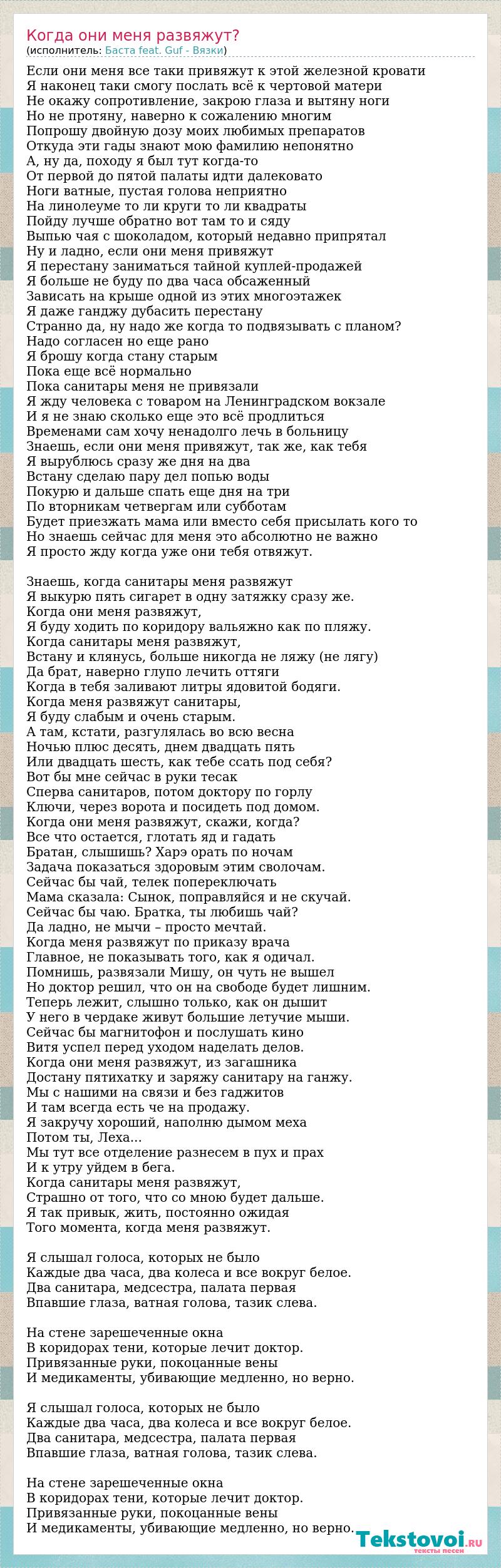 Если они меня все таки привяжут к этой железной кровати Я наконец таки смогу послать всё к чертовой матери Не окажу сопротивление, закрою глаза и вытяну ноги Но не протяну, наверно к сожалению многим Попрошу двойную дозу моих любимых препаратов Откуда эти гады знают мою фамилию непонятно А, ну да, походу я был тут когда-то От первой до пятой палаты идти далековато Ноги ватные, пустая голова неприятно На линолеуме то ли круги то ли квадраты Пойду лучше обратно вот там то и сяду Выпью чая с шоколадом, который недавно припрятал Ну и ладно, если они меня привяжут Я перестану заниматься тайной куплей-продажей Я больше не буду по два часа обсаженный Зависать на крыше одной из этих многоэтажек Я даже ганджу дубасить перестану Странно да, ну надо же когда то подвязывать с планом? Надо согласен но еще рано Я брошу когда стану старым Пока еще всё нормально Пока санитары меня не привязали Я жду человека с товаром на Ленинградском вокзале И я не знаю сколько еще это всё продлиться Временами сам хочу ненадолго лечь в больницу Знаешь, если они меня привяжут, так же, как тебя Я вырублюсь сразу же дня на два Встану сделаю пару дел попью воды Покурю и дальше спать еще дня на три По вторникам четвергам или субботам Будет приезжать мама или вместо себя присылать кого то Но знаешь сейчас для меня это абсолютно не важно Я просто жду когда уже они тебя отвяжут. Знаешь, когда санитары меня развяжут Я выкурю пять сигарет в одну затяжку сразу же. Когда они меня развяжут, Я буду ходить по коридору вальяжно как по пляжу. Когда санитары меня развяжут, Встану и клянусь, больше никогда не ляжу (не лягу) Да брат, наверно глупо лечить оттяги Когда в тебя заливают литры ядовитой бодяги. Когда меня развяжут санитары, Я буду слабым и очень старым. А там, кстати, разгулялась во всю весна Ночью плюс десять, днем двадцать пять Или двадцать шесть, как тебе ссать под себя? Вот бы мне сейчас в руки тесак Сперва санитаров, потом доктору по горлу Ключи, через ворота и посидеть под домом. Когда они меня развяжут, скажи, когда? Все что остается, глотать яд и гадать Братан, слышишь? Харэ орать по ночам Задача показаться здоровым этим сволочам. Сейчас бы чай, телек попереключать Мама сказала: Сынок, поправляйся и не скучай. Сейчас бы чаю. Братка, ты любишь чай? Да ладно, не мычи – просто мечтай. Когда меня развяжут по приказу врача Главное, не показывать того, как я одичал. Помнишь, развязали Мишу, он чуть не вышел Но доктор решил, что он на свободе будет лишним. Теперь лежит, слышно только, как он дышит У него в чердаке живут большие летучие мыши. Сейчас бы магнитофон и послушать кино Витя успел перед уходом наделать делов. Когда они меня развяжут, из загашника Достану пятихатку и заряжу санитару на ганжу. Мы с нашими на связи и без гаджитов И там всегда есть че на продажу. Я закручу хороший, наполню дымом меха Потом ты, Леха... Мы тут все отделение разнесем в пух и прах И к утру уйдем в бега. Когда санитары меня развяжут, Страшно от того, что со мною будет дальше. Я так привык, жить, постоянно ожидая Того момента, когда меня развяжут. Я слышал голоса, которых не было Каждые два часа, два колеса и все вокруг белое. Два санитара, медсестра, палата первая Впавшие глаза, ватная голова, тазик слева. На стене зарешеченные окна В коридорах тени, которые лечит доктор. Привязанные руки, покоцанные вены И медикаменты, у