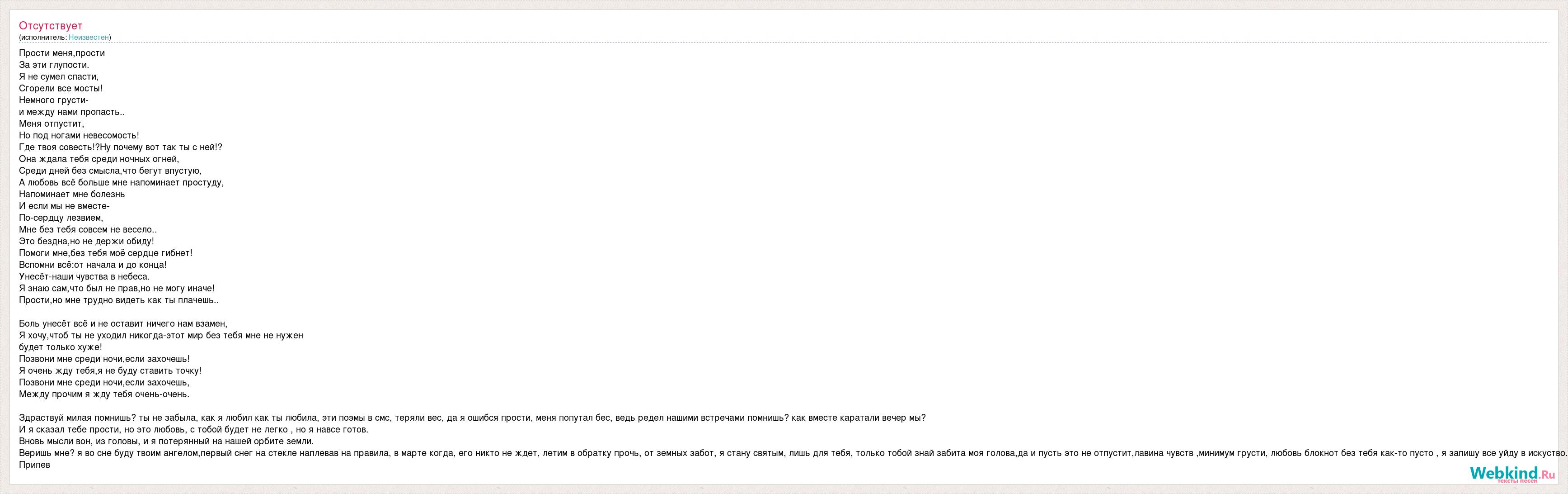 Прости меня,прости За эти глупости. Я не сумел спасти, Сгорели все мосты! Немного грусти- и между нами пропасть.. Меня отпустит, Но под ногами невесомость! Где твоя совесть!?Ну почему вот так ты с ней!? Она ждала тебя среди ночных огней, Среди дней без смысла,что бегут впустую, А любовь всё больше мне напоминает простуду, Напоминает мне болезнь И если мы не вместе- По-сердцу лезвием, Мне без тебя совсем не весело.. Это бездна,но не держи обиду! Помоги мне,без тебя моё сердце гибнет! Вспомни всё:от начала и до конца! Унесёт-наши чувства в небеса. Я знаю сам,что был не прав,но не могу иначе! Прости,но мне трудно видеть как ты плачешь.. Боль унесёт всё и не оставит ничего нам взамен, Я хочу,чтоб ты не уходил никогда-этот мир без тебя мне не нужен будет только хуже! Позвони мне среди ночи,если захочешь! Я очень жду тебя,я не буду ставить точку! Позвони мне среди ночи,если захочешь, Между прочим я жду тебя очень-очень. Здраствуй милая помнишь? ты не забыла, как я любил как ты любила, эти поэмы в смс, теряли вес, да я ошибся прости, меня попутал бес, ведь редел нашими встречами помнишь? как вместе каратали вечер мы? И я сказал тебе прости, но это любовь, с тобой будет не легко , но я навсе готов. Вновь мысли вон, из головы, и я потерянный на нашей орбите земли. Веришь мне? я во сне буду твоим ангелом,первый снег на стекле наплевав на правила, в марте когда, его никто не ждет, летим в обратку прочь, от земных забот, я стану святым, лишь для тебя, только тобой знай забита моя голова,да и пусть это не отпустит,лавина чувств ,минимум грусти, любовь блокнот без тебя как-то пусто , я запишу все уйду в искуство. Припев