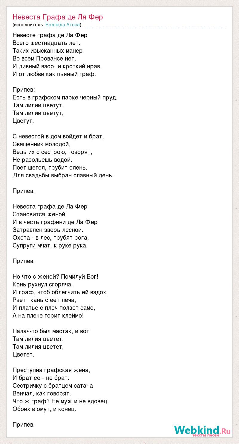 Невесте графа де Ла Фер Всего шестнадцать лет. Таких изысканных манер Во всем Провансе нет. И дивный взор, и кроткий нрав. И от любви как пьяный граф. Припев: Есть в графском парке черный пруд, Там лилии цветут. Там лилии цветут, Цветут. С невестой в дом войдет и брат, Священник молодой, Ведь их с сестрою, говорят, Не разольешь водой. Поет щегол, трубит олень. Для свадьбы выбран славный день. Припев. Невеста графа де Ла Фер Становится женой И в честь графини де Ла Фер Затравлен зверь лесной. Охота - в лес, трубят рога, Супруги мчат, к руке рука. Припев. Но что с женой? Помилуй Бог! Конь рухнул сгоряча, И граф, чтоб облегчить ей вздох, Рвет ткань с ее плеча, И платье с плеч ползет само, А на плече горит клеймо! Палач-то был мастак, и вот Там лилия цветет, Там лилия цветет, Цветет. Преступна графская жена, И брат ее - не брат. Сестричку с братцем сатана Венчал, как говорят. Что ж граф? Не муж и не вдовец. Обоих в омут, и конец. Припев.