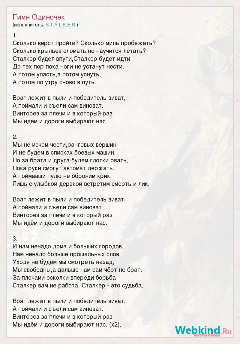 1. Сколько вёрст пройти? Сколько миль пробежать? Сколько крыльев сломать,но научится летать? Сталкер будет впути,Сталкер будет идти До тех пор пока ноги не устанут нести. А потом упасть,а потом уснуть, А потом по утру сново в путь. Враг лежит в пыли и победитель виват, А поймали и съели сам виноват. Винторез за плечи и в который раз Мы идём и дороги выбирают нас. 2. Мы не исчем чести,ранговых вершин И не будем в списках боевых машин, Но за брата и друга будем глотки рвать, Пока руки смогут автомат держать. А поймавши пулю не оброним крик, Лишь с улыбкой дерзкой встретим смерть и лик. Враг лежит в пыли и победитель виват, А поймали и съели сам виноват. Винторез за плечи и в который раз Мы идём и дороги выбирают нас. 3. И нам ненадо дома и больших городов, Нам ненадо больше прощальных слов. Уходя не будем мы смотреть назад, Мы свободны,а дальше нам сам чёрт не брат. За плечами осколки впереди борьба Сталкер вам не работа, Сталкер - это судьба. Враг лежит в пыли и победитель виват, А поймали и съели сам виноват. Винторез за плечи и в который раз Мы идём и дороги выбирают нас. (х2).