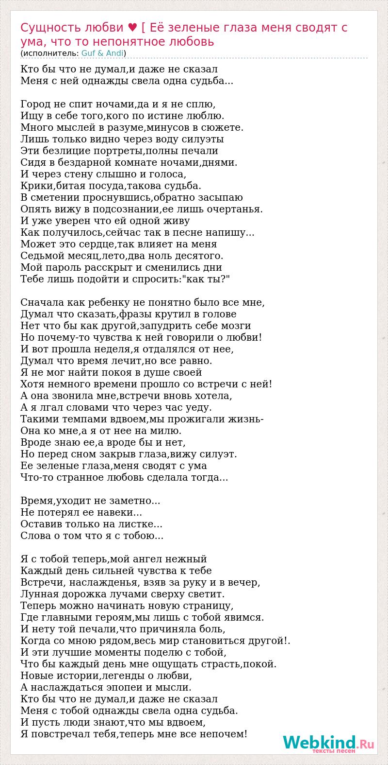 А как ты думаешь, о чем песня "Сущность любви ♥ [ Её зеленые глаза меня сводят с ума, что то непонятное " ?