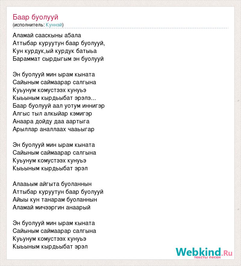 Аламай сааскыны а5ала Аттыбар куруутун баар буолууй, Кун курдук,ый курдук батыьа Бараммат сырдыгым эн буолууй Эн буолууй мин ырам кыната Сайыным саймаарар салгына Куьунум комустээх кунуьэ Кыьыным кырдьыбат эрэлэ... Баар буолууй аал уотум иннигэр Алгыс тыл алкыйар кэмигэр Анаара дойду даа аартыга Арыллар аналлаах чааьыгар Эн буолууй мин ырам кыната Сайыным саймаарар салгына Куьунум комустээх кунуьэ Кыьыным кырдьыбат эрэл Алааьым айгыта буоланнын Аттыбар куруутун баар буолууй Айыы кун танарам буоланнын Аламай мичээргин анаарый Эн буолууй мин ырам кыната Сайыным саймаарар салгына Куьунум комустээх кунуьэ Кыьыным кырдьыбат эрэл