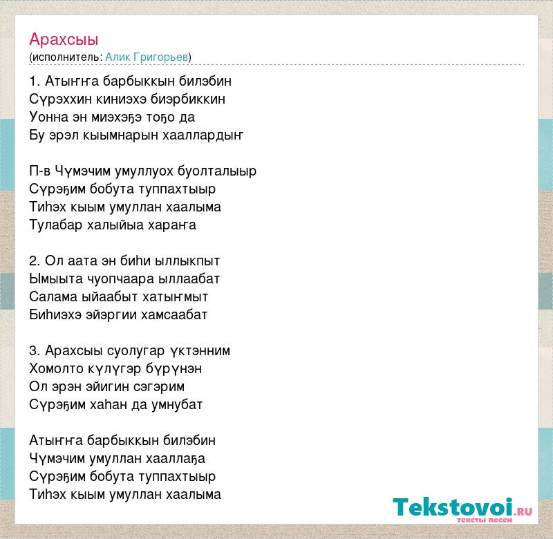 1. Атыҥҥа барбыккын билэбин Сүрэххин киниэхэ биэрбиккин Уонна эн миэхэҕэ тоҕо да Бу эрэл кыымнарын хааллардыҥ П-в Чүмэчим умуллуох буолталыыр Сүрэҕим бобута туппахтыыр Тиhэх кыым умуллан хаалыма Тулабар халыйыа хараҥа 2. Ол аата эн биhи ыллыкпыт Ымыыта чуопчаара ыллаабат Салама ыйаабыт хатыҥмыт Биhиэхэ эйэргии хамсаабат 3. Арахсыы суолугар үктэнним Хомолто күлүгэр бүрүнэн Ол эрэн эйигин сэгэрим Сүрэҕим хаhан да умнубат Атыҥҥа барбыккын билэбин Чүмэчим умуллан хааллаҕа Сүрэҕим бобута туппахтыыр Тиhэх кыым умуллан хаалыма
