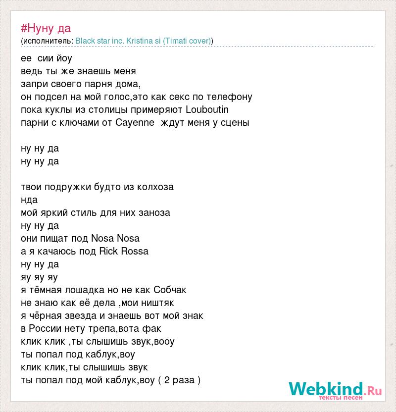 ее сии йоу ведь ты же знаешь меня запри своего парня дома, он подсел на мой голос,это как секс по телефону пока куклы из столицы примеряют Louboutin парни с ключами от Cayenne ждут меня у сцены ну ну да ну ну да твои подружки будто из колхоза нда мой яркий стиль для них заноза ну ну да они пищат под Nosa Nosa а я качаюсь под Rick Rossa ну ну да яу яу яу я тёмная лошадка но не как Собчак не знаю как её дела ,мои ништяк я чёрная звезда и знаешь вот мой знак в России нету трепа,вота фак клик клик ,ты слышишь звук,вооу ты попал под каблук,воу клик клик,ты слышишь звук ты попал под мой каблук,воу ( 2 раза )