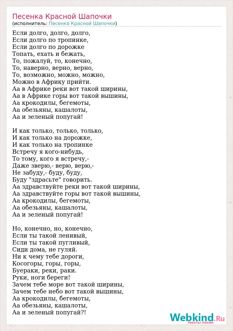 Если долго, долго, долго, Если долго по тропинке, Если долго по дорожке Топать, ехать и бежать, То, пожалуй, то, конечно, То, наверно, верно, верно, То, возможно, можно, можно, Можно в Африку прийти. Аа в Африке реки вот такой ширины, Аа в Африке горы вот такой вышины, Аа крокодилы, бегемоты, Аа обезьяны, кашалоты, Аа и зеленый попугай! И как только, только, только, И как только на дорожке, И как только на тропинке Встречу я кого-нибудь, То тому, кого я встречу,- Даже зверю,- верю, верю,- Не забуду,- буду, буду, Буду "здрасьте" говорить. Аа здравствуйте реки вот такой ширины, Аа здравствуйте горы вот такой вышины, Аа крокодилы, бегемоты, Аа обезьяны, кашалоты, Аа и зеленый попугай! Но, конечно, но, конечно, Если ты такой ленивый, Если ты такой пугливый, Сиди дома, не гуляй. Ни к чему тебе дороги, Косогоры, горы, горы, Буераки, реки, раки. Руки, ноги береги! Зачем тебе море вот такой ширины, Зачем тебе небо вот такой вышины, Аа крокодилы, бегемоты, Аа обезьяны, кашалоты, Аа и зеленый попугай?!