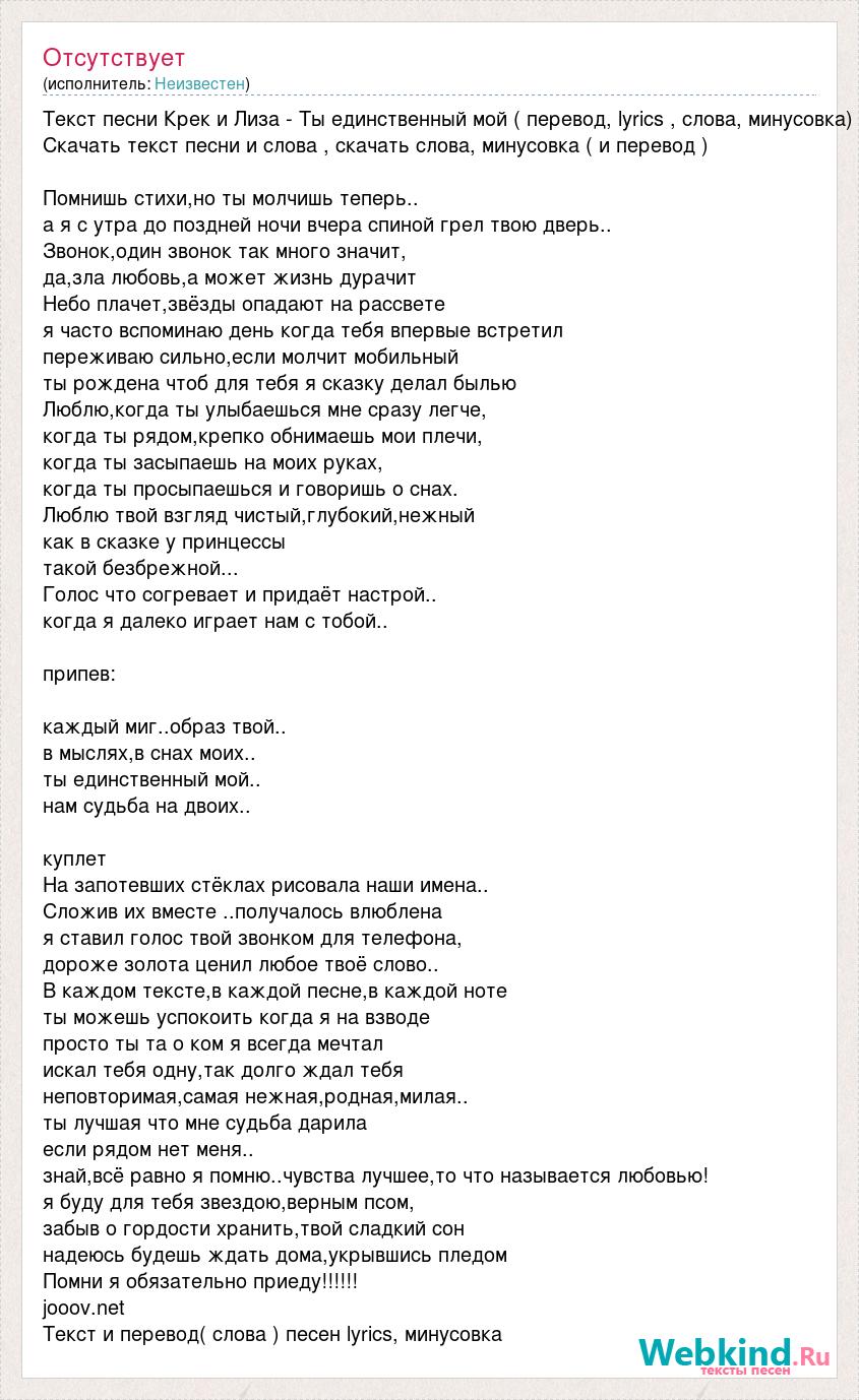 Текст песни Крек и Лиза - Ты единственный мой ( перевод, lyrics , слова, минусовка) Скачать текст песни и слова , скачать слова, минусовка ( и перевод ) Помнишь стихи,но ты молчишь теперь.. а я с утра до поздней ночи вчера спиной грел твою дверь.. Звонок,один звонок так много значит, да,зла любовь,а может жизнь дурачит Небо плачет,звёзды опадают на рассвете я часто вспоминаю день когда тебя впервые встретил переживаю сильно,если молчит мобильный ты рождена чтоб для тебя я сказку делал былью Люблю,когда ты улыбаешься мне сразу легче, когда ты рядом,крепко обнимаешь мои плечи, когда ты засыпаешь на моих руках, когда ты просыпаешься и говоришь о снах. Люблю твой взгляд чистый,глубокий,нежный как в сказке у принцессы такой безбрежной... Голос что согревает и придаёт настрой.. когда я далеко играет нам с тобой.. припев: каждый миг..образ твой.. в мыслях,в снах моих.. ты единственный мой.. нам судьба на двоих.. куплет На запотевших стёклах рисовала наши имена.. Сложив их вместе ..получалось влюблена я ставил голос твой звонком для телефона, дороже золота ценил любое твоё слово.. В каждом тексте,в каждой песне,в каждой ноте ты можешь успокоить когда я на взводе просто ты та о ком я всегда мечтал искал тебя одну,так долго ждал тебя неповторимая,самая нежная,родная,милая.. ты лучшая что мне судьба дарила если рядом нет меня.. знай,всё равно я помню..чувства лучшее,то что называется любовью! я буду для тебя звездою,верным псом, забыв о гордости хранить,твой сладкий сон надеюсь будешь ждать дома,укрывшись пледом Помни я обязательно приеду!!!!!! jooov.net Текст и перевод( слова ) песен lyrics, минусовка