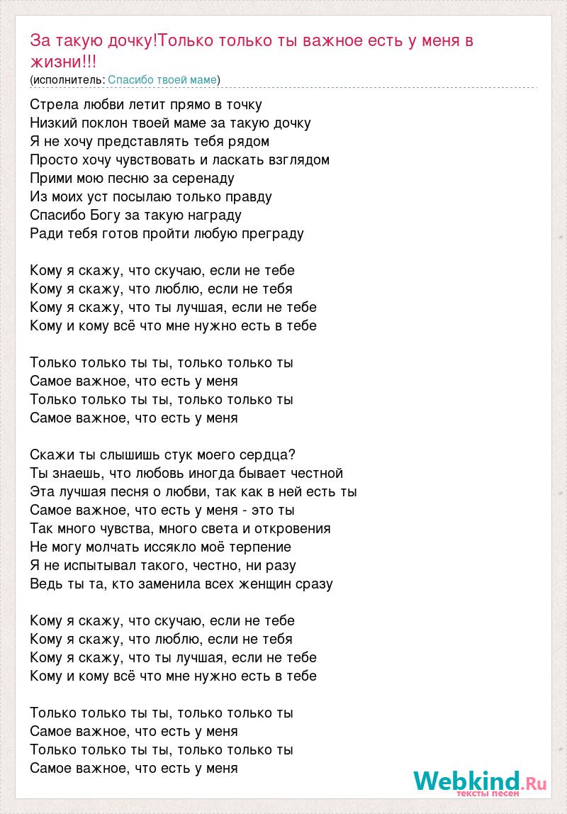Стрела любви летит прямо в точку Низкий поклон твоей маме за такую дочку Я не хочу представлять тебя рядом Просто хочу чувствовать и ласкать взглядом Прими мою песню за серенаду Из моих уст посылаю только правду Спасибо Богу за такую награду Ради тебя готов пройти любую преграду Кому я скажу, что скучаю, если не тебе Кому я скажу, что люблю, если не тебя Кому я скажу, что ты лучшая, если не тебе Кому и кому всё что мне нужно есть в тебе Только только ты ты, только только ты Самое важное, что есть у меня Только только ты ты, только только ты Самое важное, что есть у меня Скажи ты слышишь стук моего сердца? Ты знаешь, что любовь иногда бывает честной Эта лучшая песня о любви, так как в ней есть ты Самое важное, что есть у меня - это ты Так много чувства, много света и откровения Не могу молчать иссякло моё терпение Я не испытывал такого, честно, ни разу Ведь ты та, кто заменила всех женщин сразу Кому я скажу, что скучаю, если не тебе Кому я скажу, что люблю, если не тебя Кому я скажу, что ты лучшая, если не тебе Кому и кому всё что мне нужно есть в тебе Только только ты ты, только только ты Самое важное, что есть у меня Только только ты ты, только только ты Самое важное, что есть у меня