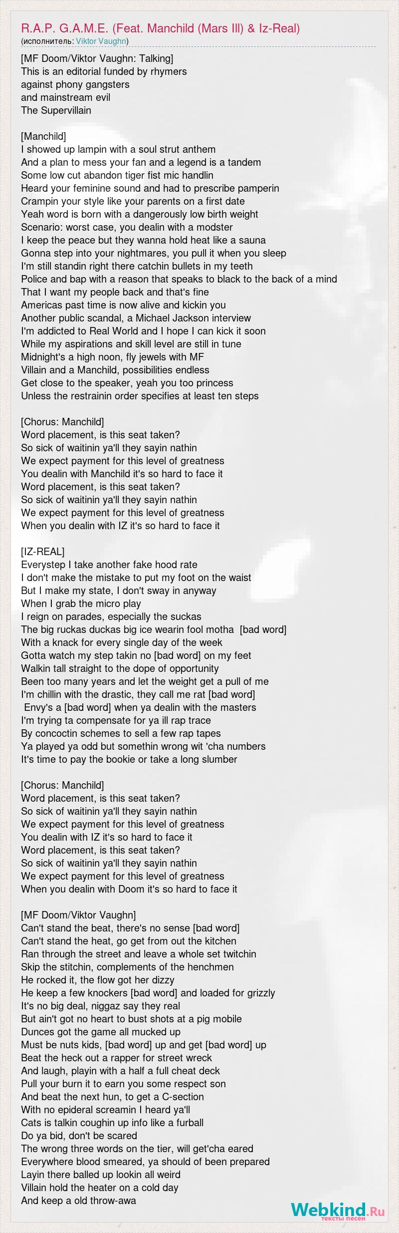 [MF Doom/Viktor Vaughn: Talking] This is an editorial funded by rhymers against phony gangsters and mainstream evil The Supervillain [Manchild] I showed up lampin with a soul strut anthem And a plan to mess your fan and a legend is a tandem Some low cut abandon tiger fist mic handlin Heard your feminine sound and had to prescribe pamperin Crampin your style like your parents on a first date Yeah word is born with a dangerously low birth weight Scenario: worst case, you dealin with a modster I keep the peace but they wanna hold heat like a sauna Gonna step into your nightmares, you pull it when you sleep I'm still standin right there catchin bullets in my teeth Police and bap with a reason that speaks to black to the back of a mind That I want my people back and that's fine Americas past time is now alive and kickin you Another public scandal, a Michael Jackson interview I'm addicted to Real World and I hope I can kick it soon While my aspirations and skill level are still in tune Midnight's a high noon, fly jewels with MF Villain and a Manchild, possibilities endless Get close to the speaker, yeah you too princess Unless the restrainin order specifies at least ten steps [Chorus: Manchild] Word placement, is this seat taken? So sick of waitinin ya'll they sayin nathin We expect payment for this level of greatness You dealin with Manchild it's so hard to face it Word placement, is this seat taken? So sick of waitinin ya'll they sayin nathin We expect payment for this level of greatness When you dealin with IZ it's so hard to face it [IZ-REAL] Everystep I take another fake hood rate I don't make the mistake to put my foot on the waist But I make my state, I don't sway in anyway When I grab the micro play I reign on parades, especially the suckas The big ruckas duckas big ice wearin fool motha [bad word] With a knack for every single day of the week Gotta watch my step takin no [bad word] on my feet Walkin tall straight to the dope of opportunity Been too many years and let the weight get a pull of me I'm chillin with the drastic, they call me rat [bad word] Envy's a [bad word] when ya dealin with the masters I'm trying ta compensate for ya ill rap trace By concoctin schemes to sell a few rap tapes Ya played ya odd but somethin wrong wit 'cha numbers It's time to pay the bookie or take a long slumber [Chorus: Manchild] Word placement, is this seat taken? So sick of waitinin ya'll they sayin nathin We expect payment for this level of greatness You dealin with IZ it's so hard to face it Word placement, is this seat taken? So sick of waitinin ya'll they sayin nathin We expect payment for this level of greatness When you dealin with Doom it's so hard to face it [MF Doom/Viktor Vaughn] Can't stand the beat, there's no sense [bad word] Can't stand the heat, go get from out the kitchen Ran through the street and leave a whole set twitchin Skip the stitchin, complements of the henchmen He rocked it, the flow got her dizzy He keep a few knockers [bad word] and loaded for grizzly It's no big deal, niggaz say they real But ain't got no heart to bust shots at a pig mobile Dunces got the game all mucked up Must be nuts kids, [bad word] up and get [bad word] up Beat the heck out a rapper for street wreck And laugh, playin with a half a full cheat deck Pull your burn it to earn you some respect son And beat the next hun, to get a C-section With no epideral screamin I heard ya'll Cats is talkin coughin up info like a furball Do ya bid, don't be scared The wrong three words on the tier, will get'cha eared Everywhere blood smeared, ya should of been prepared Layin there balled up lookin all weird Villain hold the heater on a cold day And keep a old throw-awa