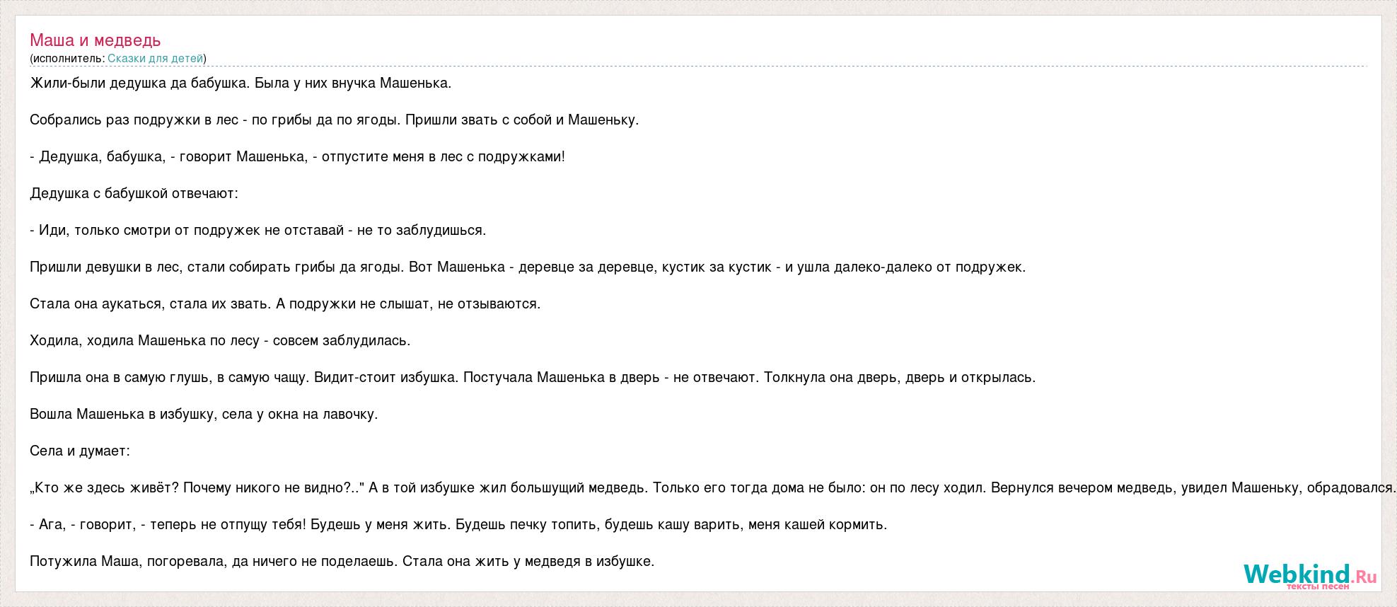 Жили-были дедушка да бабушка. Была у них внучка Машенька. Собрались раз подружки в лес - по грибы да по ягоды. Пришли звать с собой и Машеньку. - Дедушка, бабушка, - говорит Машенька, - отпустите меня в лес с подружками! Дедушка с бабушкой отвечают: - Иди, только смотри от подружек не отставай - не то заблудишься. Пришли девушки в лес, стали собирать грибы да ягоды. Вот Машенька - деревце за деревце, кустик за кустик - и ушла далеко-далеко от подружек. Стала она аукаться, стала их звать. А подружки не слышат, не отзываются. Ходила, ходила Машенька по лесу - совсем заблудилась. Пришла она в самую глушь, в самую чащу. Видит-стоит избушка. Постучала Машенька в дверь - не отвечают. Толкнула она дверь, дверь и открылась. Вошла Машенька в избушку, села у окна на лавочку. Села и думает: „Кто же здесь живёт? Почему никого не видно?.." А в той избушке жил большущий медведь. Только его тогда дома не было: он по лесу ходил. Вернулся вечером медведь, увидел Машеньку, обрадовался. - Ага, - говорит, - теперь не отпущу тебя! Будешь у меня жить. Будешь печку топить, будешь кашу варить, меня кашей кормить. Потужила Маша, погоревала, да ничего не поделаешь. Стала она жить у медведя в избушке.