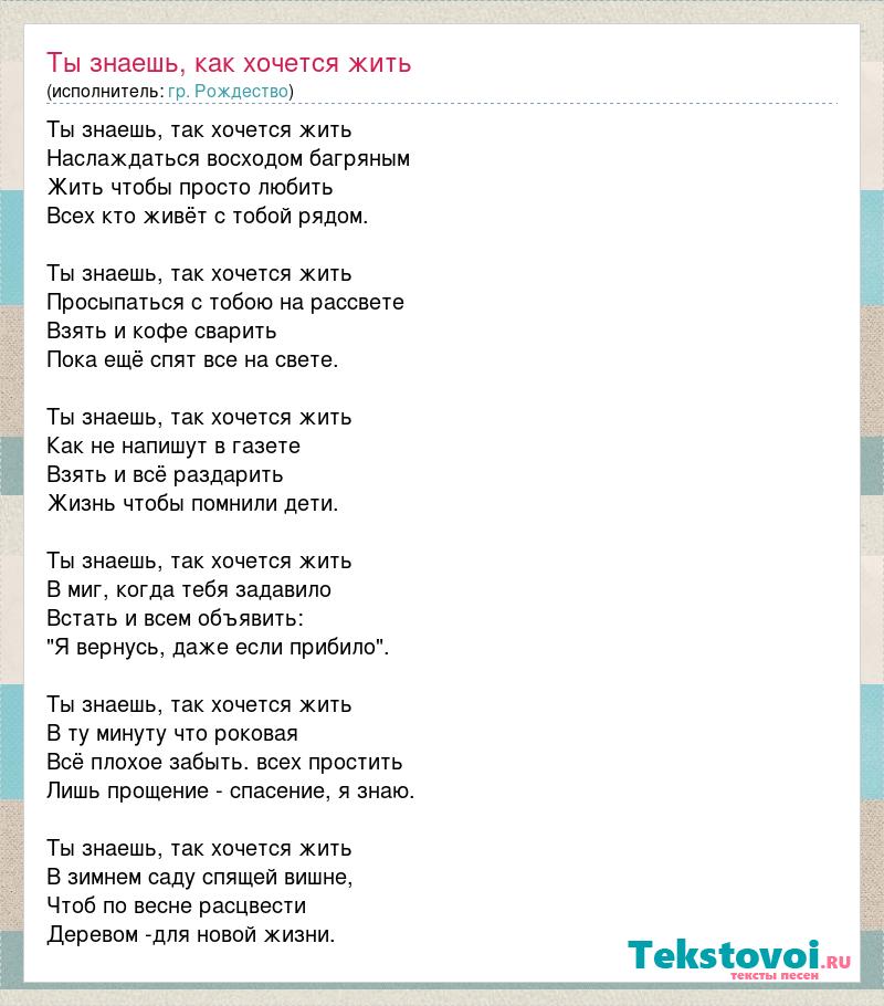 Ты знаешь, так хочется жить Наслаждаться восходом багряным Жить чтобы просто любить Всех кто живёт с тобой рядом. Ты знаешь, так хочется жить Просыпаться с тобою на рассвете Взять и кофе сварить Пока ещё спят все на свете. Ты знаешь, так хочется жить Как не напишут в газете Взять и всё раздарить Жизнь чтобы помнили дети. Ты знаешь, так хочется жить В миг, когда тебя задавило Встать и всем объявить: "Я вернусь, даже если прибило". Ты знаешь, так хочется жить В ту минуту что роковая Всё плохое забыть. всех простить Лишь прощение - спасение, я знаю. Ты знаешь, так хочется жить В зимнем саду спящей вишне, Чтоб по весне расцвести Деревом -для новой жизни.