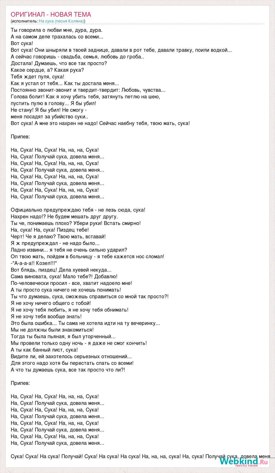 Ты говорила о любви мне, дура, дура. А на самом деле трахалась со всеми... Вот сука! Вот сука! Они шныряли в твоей заднице, давали в рот тебе, давали травку, поили водкой... А сейчас говоришь - свадьба, семья, любовь до гроба.. Достала! Думаешь, что все так просто? Какое сердце, а? Какая рука? Тебя ждет пуля, сука! Как я устал от тебя... Как ты достала меня... Постоянно звонит-звонит и твердит-твердит: Любовь, чувства... Голова болит! Как я хочу убить тебя, затянуть петлю на шею, пустить пулю в голову... Я бы убил! Не стану! Я бы убил! Не смогу - меня посадят за убийство суки.. Вот сука! А мне это нахрен не надо! Сейчас наебну тебя, твою мать, сука! Припев: На, Сука! На, Сука! На, на, на, Сука! На, Сука! Получай сука, довела меня... На, Сука! На, Сука! На, на, на, Сука! На, Сука! Получай сука, довела меня... На, Сука! На, Сука! На, на, на, Сука! На, Сука! Получай сука, довела меня... На, Сука! На, Сука! На, на, на, Сука! На, Сука! Получай сука, довела меня... Официально предупреждаю тебя - не лезь сюда, сука! Нахрен надо!? Не будем мешать друг другу. Ты че, понимаешь плохо? Убери руки! Встать смирно! На, сука! На, сука! Пиздец тебе! Черт! Че я делаю? Твою мать, вставай! Я ж предупреждал - не надо было... Ладно извини... я тебя не очень сильно ударил? Оп твою мать, пойдем в больницу - я тебе кажется нос сломал! -"А-а-а-а!! Козел!!!" Вот блядь, пиздец! Дела хуевей некуда... Сама виновата, сука! Мало тебе?! Добавлю! По-человечески просил - все, хватит надоело мне! А ты просто сука ничего не хочешь понимать! Ты что думаешь, сука, сможешь справиться со мной так просто?! Я не хочу ничего общего с тобой! Я не хочу тебя любить, я не хочу тебя обнимать! Я не хочу тебя вообще знать! Это была ошибка... Ты сама не хотела идти на ту вечеринку... Мы не должны были знакомиться! Тогда ты была пьяная, я был уторченный... Мы провели только одну ночь - я даже не смог кончить! А ты как банный лист, сука! Видите ли, ей захотелось серьезных отношений... Для этого надо хотя бы перестать спать со всеми! А что ты думаешь сука, все так просто что ли?! Припев: На, Сука! На, Сука! На, на, на, Сука! На, Сука! Получай сука, довела меня... На, Сука! На, Сука! На, на, на, Сука! На, Сука! Получай сука, довела меня... На, Сука! На, Сука! На, на, на, Сука! На, Сука! Получай сука, довела меня... На, Сука! На, Сука! На, на, на, Сука! На, Сука! Получай сука, довела меня... Сука! Сука! На сука! Получай! Сука! На сука! На сука! На, на, на, сука! На, сука! Получай сука, довела меня...