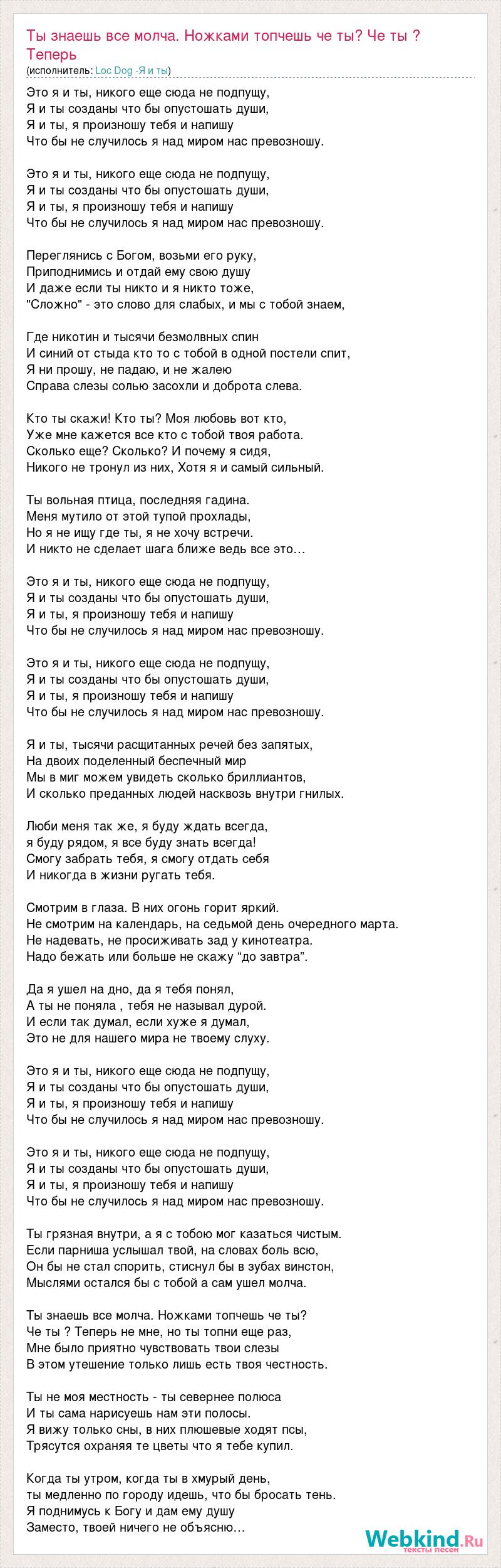 Главная→Исполнители→Loc Dog -Я и ты→Ты знаешь все молча. Ножками топчешь че ты? Че ты ? Теперь не мне, но