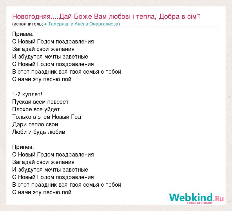 Привев: С Новый Годом поздравления Загадай свои желания И збудутся мечты заветные С Новый Годом поздравления В этот праздник вся твоя семья с тобой С нами эту песню пой 1-й куплет! Пускай всем повезет Плохое все уйдет Только в этом Новый Год Дари тепло свои Люби и будь любим Припев: С Новый Годом поздравления Загадай свои желания И збудутся мечты заветные С Новый Годом поздравления В этот праздник вся твоя семья с тобой С нами эту песню пой
