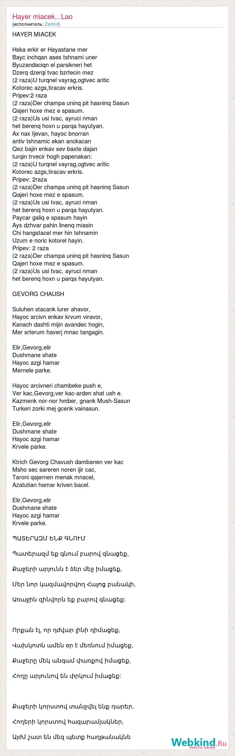 HAYER MIACEK Hska erkir er Hayastane mer Bayc inchqan ases tshnami uner Byuzandaciqn el parsikneri het Dzerq dzerqi tvac bzrtecin mez (2 raza)U turqnel vayrag,ogtvec aritic Kotorec azgs,tiracav erkris. Pripev:2 raza (2 raza)Der champa uninq pit hasninq Sasun Qajeri hoxe mez e spasum. (2 raza)Us usi tvac, ayruci nman het berenq hoxn u parqa hayutyan. Ax nax Ijevan, hayoc bnorran antiv tshnamic ekan anckacan Qez bajin enkav sev baxte dajan turqin trvecir hogh papenakan: (2 raza)U turqnel vayrag,ogtvec aritic Kotorec azgs,tiracav erkris. Pripev: 2raza (2 raza)Der champa uninq pit hasninq Sasun Qajeri hoxe mez e spasum. (2 raza)Us usi tvac, ayruci nman het berenq hoxn u parqa hayutyan. Paycar galiq e spasum hayin Ays dzhvar pahin linenq miasin Chi hangstacel mer hin tshnamin Uzum e noric kotorel hayin. Pripev: 2 raza (2 raza)Der champa uninq pit hasninq Sasun Qajeri hoxe mez e spasum. (2 raza)Us usi tvac, ayruci nman het berenq hoxn u parqa hayutyan. GEVORG CHAUSH Suluhen stacank lurer ahavor, Hayoc arcivn enkav krvum viravor, Kanach dashti mijin avandec hogin, Mer srterum haverj mnac tangagin. Elir,Gevorg,elir Dushmane shate Hayoc azgi hamar Mernele parke. Hayoc arcivneri chambeke push e, Ver kac,Gevorg,ver kac-arden shat ush e. Kazmenk nor-nor hmber, gnank Mush-Sasun Turkeri zorki mej gcenk vainasun. Elir,Gevorg,elir Dushmane shate Hayoc azgi hamar Krvele parke. Ktrich Gevorg Chavush dambanen ver kac Msho sec sareren noren ijir cac, Taroni qajernen menak mnacel, Azatutian hamar kriven bacel. Elir,Gevorg,elir Dushmane shate Hayoc azgi hamar Krvele parke. ՊԱՏԵՐԱԶՄ ԵՆՔ ԳՆՈՒՄ Պատերազմ եք գնում բարով գնացեք, Քաջերի արյունն է ձեր մեջ իմացեք, Մեր նոր կազմավորվող Հայոց բանակի, Առաջին զինվորն եք բարով գնացեք: Որքան էլ, որ դժվար լինի դիմացեք, Վախկոտն ամեն օր է մեռնում իմացեք, Քաջերը մեկ անգամ փառքով իմացեք, Հողը արյունով են փրկում իմացեք: Քաջերի կորստով տանջվել ենք դարեր, Հողերի կորստով հազարամյակներ, Այժմ շատ են մեզ պետք հաղթանակնե