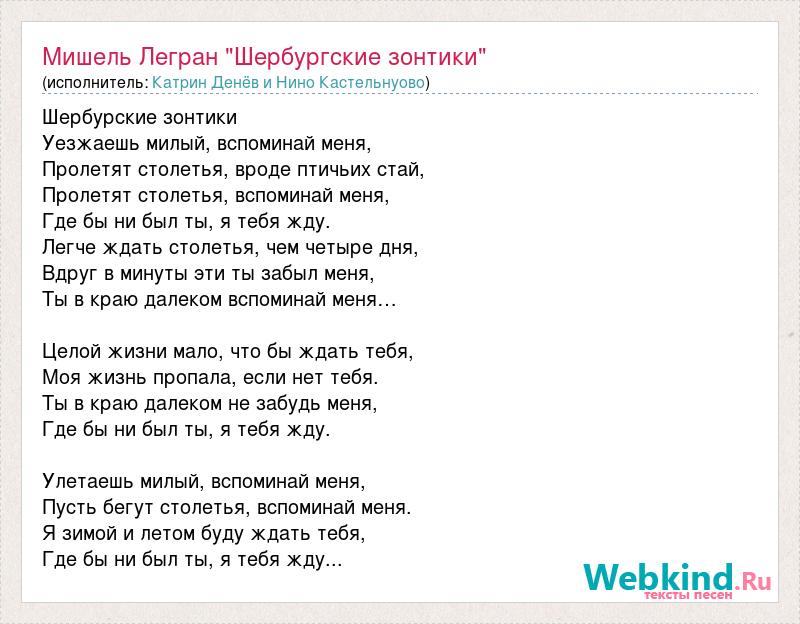 Шербурские зонтики Уезжаешь милый, вспоминай меня, Пролетят столетья, вроде птичьих стай, Пролетят столетья, вспоминай меня, Где бы ни был ты, я тебя жду. Легче ждать столетья, чем четыре дня, Вдруг в минуты эти ты забыл меня, Ты в краю далеком вспоминай меня… Целой жизни мало, что бы ждать тебя, Моя жизнь пропала, если нет тебя. Ты в краю далеком не забудь меня, Где бы ни был ты, я тебя жду. Улетаешь милый, вспоминай меня, Пусть бегут столетья, вспоминай меня. Я зимой и летом буду ждать тебя, Где бы ни был ты, я тебя жду...