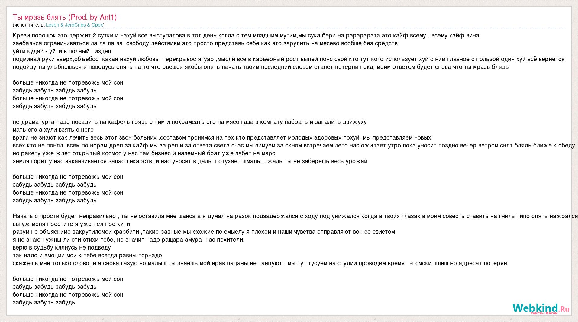 Крези порошок,это держит 2 сутки и нахуй все выступалова в тот день когда с тем младшим мутим,мы сука бери на рарарарата это кайф всему , всему кайф вина заебалься ограничиваться ла ла ла ла свободу действиям это просто представь себе,как это зарулить на месево вообще без средств уйти куда? - уйти в полный пиздец подминай руки вверх,объебос какая нахуй любовь перекрывос ягуар ,мысли все в карьерный рост выпей понс свой кто тут кого использует хуй с ним главное с пользой один хуй всё вернется подойду ты улыбнешься я поведусь опять на то что рвешся якобы опять начать твоим последний словом станет потерпи пока, моим ответом будет снова что ты мразь блядь больше никогда не потревожь мой сон забудь забудь забудь забудь больше никогда не потревожь мой сон забудь забудь забудь забудь не драматурга надо посадить на кафель грязь с ним и покрамсать его на мясо газа в комнату набрать и запалить движуху мать его а хули взять с него враги не знают как лечить весь этот звон больних .составом тронимся на тех кто представляет молодых здоровых похуй, мы представляем новых всех кто не понял, всем по норам дреп за кайф мы за реп и за ответа света счас мы зимуем за окном встречаем лето нас ожидает утро пока уносит поздно вечер ветром снят блядь ближе к обеду но ракету уже ждет открытый космос у нас там бизнес и наземный брат уже забет на марс земля горит у нас заканчивается запас лекарств, и нас уносит в даль .потухает шмаль....жаль ты не заберешь весь урожай больше никогда не потревожь мой сон забудь забудь забудь забудь больше никогда не потревожь мой сон забудь забудь забудь забудь Начать с прости будет неправильно , ты не оставила мне шанса а я думал на разок подзадержался с ходу под унижался когда в твоих глазах в моим совесть ставить на гниль типо опять нажрался вы уж меня простите я уже пел про кити разум не объяснимо закрутиломой фарбити ,такие разные мы схожие по смыслу я плохой и наши чувства отправляют вон со свистом я не знаю нужны ли эти стихи тебе, но значит надо ращара амура нас похители. верю в судьбу клянусь не подведу так надо и эмоции мои к тебе всегда равны торнадо скажешь мне только слово, и я снова газую но малыш ты знаешь мой нрав пацаны не танцуют , мы тут тусуем на студии проводим время ты смски шлеш но адресат потерян больше никогда не потревожь мой сон забудь забудь забудь забудь больше никогда не потревожь мой сон забудь забудь забудь