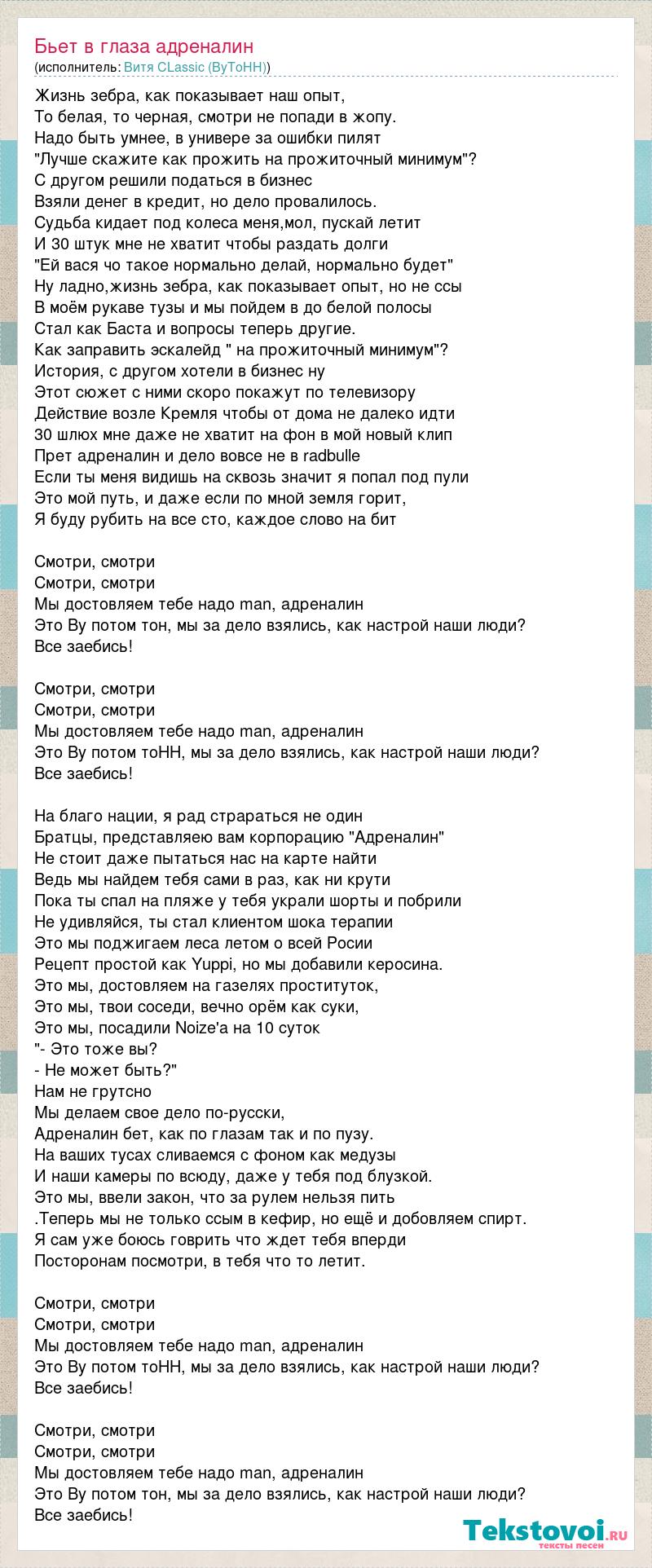 Жизнь зебра, как показывает наш опыт, То белая, то черная, смотри не попади в жопу. Надо быть умнее, в универе за ошибки пилят "Лучше скажите как прожить на прожиточный минимум"? С другом решили податься в бизнес Взяли денег в кредит, но дело провалилось. Судьба кидает под колеса меня,мол, пускай летит И 30 штук мне не хватит чтобы раздать долги "Ей вася чо такое нормально делай, нормально будет" Ну ладно,жизнь зебра, как показывает опыт, но не ссы В моём рукаве тузы и мы пойдем в до белой полосы Стал как Баста и вопросы теперь другие. Как заправить эскалейд " на прожиточный минимум"? История, с другом хотели в бизнес ну Этот сюжет с ними скоро покажут по телевизору Действие возле Кремля чтобы от дома не далеко идти 30 шлюх мне даже не хватит на фон в мой новый клип Прет адреналин и дело вовсе не в radbulle Если ты меня видишь на сквозь значит я попал под пули Это мой путь, и даже если по мной земля горит, Я буду рубить на все сто, каждое слово на бит Смотри, смотри Смотри, смотри Мы достовляем тебе надо man, адреналин Это Ву потом тон, мы за дело взялись, как настрой наши люди? Все заебись! Смотри, смотри Смотри, смотри Мы достовляем тебе надо man, адреналин Это Ву потом тоНН, мы за дело взялись, как настрой наши люди? Все заебись! На благо нации, я рад страраться не один Братцы, представляею вам корпорацию "Адреналин" Не стоит даже пытаться нас на карте найти Ведь мы найдем тебя сами в раз, как ни крути Пока ты спал на пляже у тебя украли шорты и побрили Не удивляйся, ты стал клиентом шока терапии Это мы поджигаем леса летом о всей Росии Рецепт простой как Yuppi, но мы добавили керосина. Это мы, достовляем на газелях проституток, Это мы, твои соседи, вечно орём как суки, Это мы, посадили Noizе'a на 10 суток "- Это тоже вы? - Не может быть?" Нам не грутсно Мы делаем свое дело по-русски, Адреналин бет, как по глазам так и по пузу. На ваших тусах сливаемся с фоном как медузы И наши камеры по всюду, даже у тебя под блузкой. Это мы, ввели закон, что за рулем нельзя пить .Теперь мы не только ссым в кефир, но ещё и добовляем спирт. Я сам уже боюсь говрить что ждет тебя вперди Посторонам посмотри, в тебя что то летит. Смотри, смотри Смотри, смотри Мы достовляем тебе надо man, адреналин Это Ву потом тоНН, мы за дело взялись, как настрой наши люди? Все заебись! Смотри, смотри Смотри, смотри Мы достовляем тебе надо man, адреналин Это Ву потом тон, мы за дело взялись, как настрой наши люди? Все заебись!