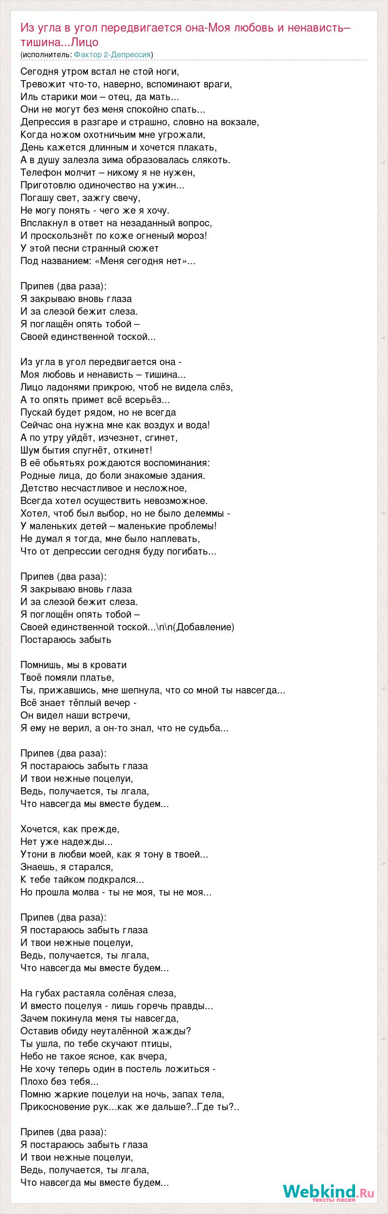 Главная→Исполнители→Фактор 2-Депрессия→Из угла в угол передвигается она-Моя любовь и ненависть–тишина...Лицо