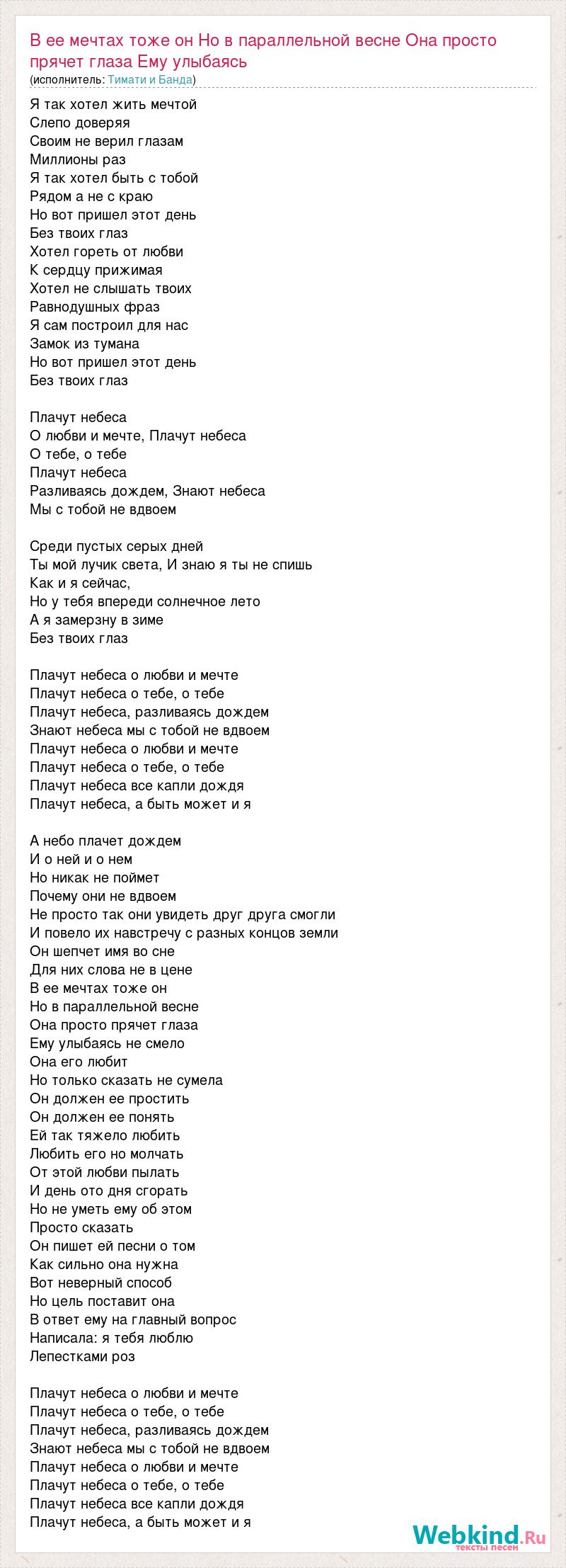 Главная→Исполнители→Тимати и Банда→В ее мечтах тоже он Но в параллельной весне Она просто прячет глаза Ему улыбая