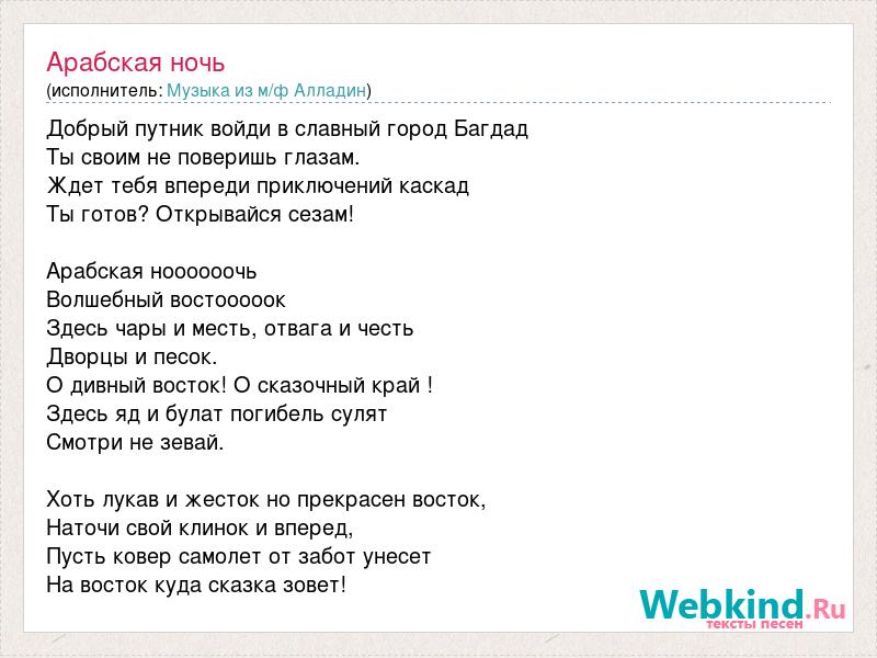 Добрый путник войди в славный город Багдад Ты своим не поверишь глазам. Ждет тебя впереди приключений каскад Ты готов? Открывайся сезам! Арабская ноооооочь Волшебный востооооок Здесь чары и месть, отвага и честь Дворцы и песок. О дивный восток! О сказочный край ! Здесь яд и булат погибель сулят Смотри не зевай. Хоть лукав и жесток но прекрасен восток, Наточи свой клинок и вперед, Пусть ковер самолет от забот унесет На восток куда сказка зовет!