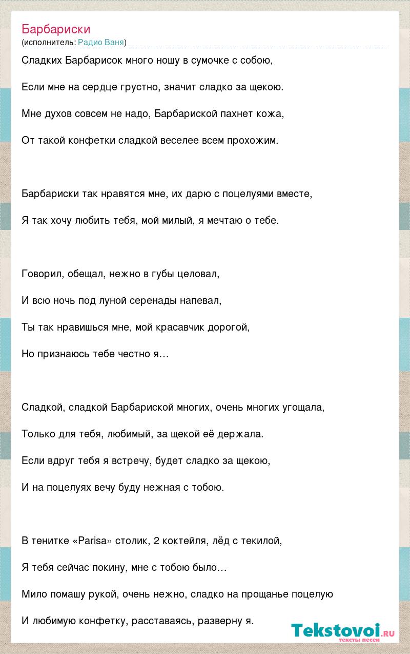 Сладких Барбарисок много ношу в сумочке с собою, Если мне на сердце грустно, значит сладко за щекою. Мне духов совсем не надо, Барбариской пахнет кожа, От такой конфетки сладкой веселее всем прохожим. Барбариски так нравятся мне, их дарю с поцелуями вместе, Я так хочу любить тебя, мой милый, я мечтаю о тебе. Говорил, обещал, нежно в губы целовал, И всю ночь под луной серенады напевал, Ты так нравишься мне, мой красавчик дорогой, Но признаюсь тебе честно я… Сладкой, сладкой Барбариской многих, очень многих угощала, Только для тебя, любимый, за щекой её держала. Если вдруг тебя я встречу, будет сладко за щекою, И на поцелуях вечу буду нежная с тобою. В тенитке «Parisa» столик, 2 коктейля, лёд с текилой, Я тебя сейчас покину, мне с тобою было… Мило помашу рукой, очень нежно, сладко на прощанье поцелую И любимую конфетку, расставаясь, разверну я.