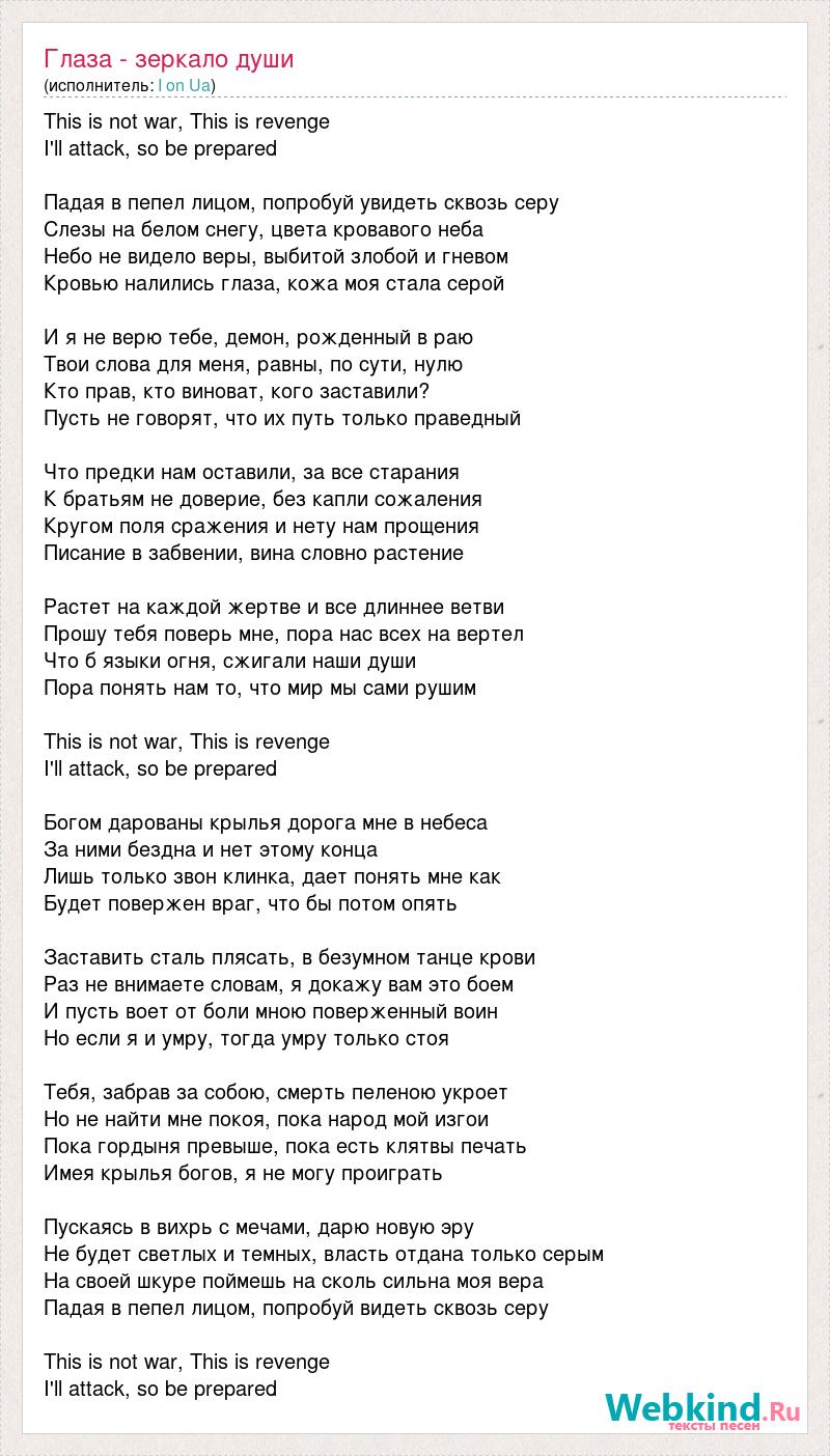 This is not war, This is revenge I'll attack, so be prepared Падая в пепел лицом, попробуй увидеть сквозь серу Слезы на белом снегу, цвета кровавого неба Небо не видело веры, выбитой злобой и гневом Кровью налились глаза, кожа моя стала серой И я не верю тебе, демон, рожденный в раю Твои слова для меня, равны, по сути, нулю Кто прав, кто виноват, кого заставили? Пусть не говорят, что их путь только праведный Что предки нам оставили, за все старания К братьям не доверие, без капли сожаления Кругом поля сражения и нету нам прощения Писание в забвении, вина словно растение Растет на каждой жертве и все длиннее ветви Прошу тебя поверь мне, пора нас всех на вертел Что б языки огня, сжигали наши души Пора понять нам то, что мир мы сами рушим This is not war, This is revenge I'll attack, so be prepared Богом дарованы крылья дорога мне в небеса За ними бездна и нет этому конца Лишь только звон клинка, дает понять мне как Будет повержен враг, что бы потом опять Заставить сталь плясать, в безумном танце крови Раз не внимаете словам, я докажу вам это боем И пусть воет от боли мною поверженный воин Но если я и умру, тогда умру только стоя Тебя, забрав за собою, смерть пеленою укроет Но не найти мне покоя, пока народ мой изгои Пока гордыня превыше, пока есть клятвы печать Имея крылья богов, я не могу проиграть Пускаясь в вихрь с мечами, дарю новую эру Не будет светлых и темных, власть отдана только серым На своей шкуре поймешь на сколь сильна моя вера Падая в пепел лицом, попробуй видеть сквозь серу This is not war, This is revenge I'll attack, so be prepared