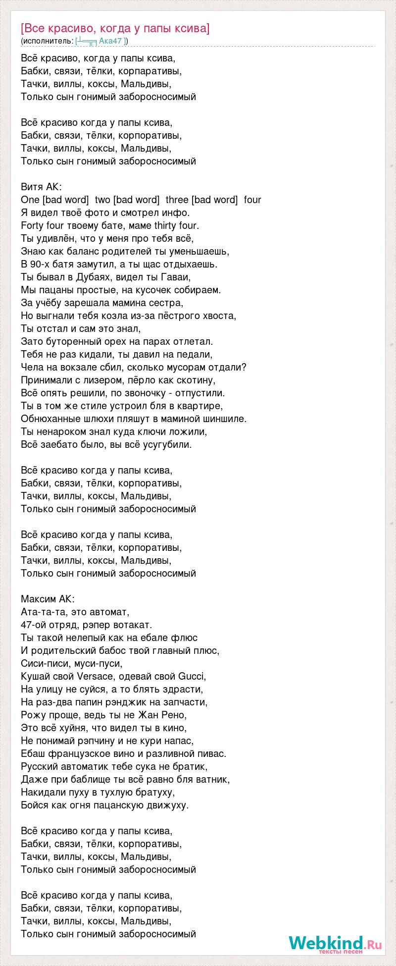 Всё красиво, когда у папы ксива, Бабки, связи, тёлки, корпаративы, Тачки, виллы, коксы, Мальдивы, Только сын гонимый заборосносимый Всё красиво когда у папы ксива, Бабки, связи, тёлки, корпоративы, Тачки, виллы, коксы, Мальдивы, Только сын гонимый заборосносимый Витя АК: One [bad word] two [bad word] three [bad word] four Я видел твоё фото и смотрел инфо. Forty four твоему бате, маме thirty four. Ты удивлён, что у меня про тебя всё, Знаю как баланс родителей ты уменьшаешь, В 90-х батя замутил, а ты щас отдыхаешь. Ты бывал в Дубаях, видел ты Гаваи, Мы пацаны простые, на кусочек собираем. За учёбу зарешала мамина сестра, Но выгнали тебя козла из-за пёстрого хвоста, Ты отстал и сам это знал, Зато буторенный орех на парах отлетал. Тебя не раз кидали, ты давил на педали, Чела на вокзале сбил, сколько мусорам отдали? Принимали с лизером, пёрло как скотину, Всё опять решили, по звоночку - отпустили. Ты в том же стиле устроил бля в квартире, Обнюханные шлюхи пляшут в маминой шиншиле. Ты ненароком знал куда ключи ложили, Всё заебато было, вы всё усугубили. Всё красиво когда у папы ксива, Бабки, связи, тёлки, корпоративы, Тачки, виллы, коксы, Мальдивы, Только сын гонимый заборосносимый Всё красиво когда у папы ксива, Бабки, связи, тёлки, корпоративы, Тачки, виллы, коксы, Мальдивы, Только сын гонимый заборосносимый Максим АК: Ата-та-та, это автомат, 47-ой отряд, рэпер вотакат. Ты такой нелепый как на ебале флюc И родительский бабос твой главный плюс, Сиси-писи, муси-пуси, Кушай свой Versace, одевай свой Gucci, На улицу не суйся, а то блять здрасти, На раз-два папин рэнджик на запчасти, Рожу проще, ведь ты не Жан Рено, Это всё хуйня, что видел ты в кино, Не понимай рэпчину и не кури напас, Ебаш французское вино и разливной пивас. Русский автоматик тебе сука не братик, Даже при баблище ты всё равно бля ватник, Накидали пуху в тухлую братуху, Бойся как огня пацанскую движуху. Всё красиво когда у папы ксива, Бабки, связи, тёлки, корпоративы, Тачки, виллы, коксы, Мальдивы, Только сын гонимый заборосносимый Всё красиво когда у папы ксива, Бабки, связи, тёлки, корпоративы, Тачки, виллы, коксы, Мальдивы, Только сын гонимый заборосносимый