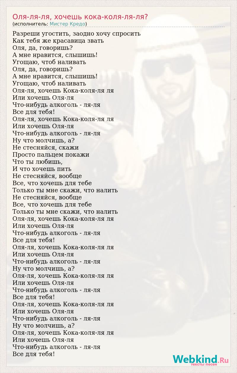 Разреши угостить, заодно хочу спросить Как тебя же красавица звать Оля, да, говоришь? А мне нравится, слышишь! Угощаю, чтоб наливать Оля, да, говоришь? А мне нравится, слышишь! Угощаю, чтоб наливать Оля-ля, хочешь Кока-коля-ля ля Или хочешь Оля-ля Что-нибудь алкоголь - ля-ля Все для тебя! Оля-ля, хочешь Кока-коля-ля ля Или хочешь Оля-ля Что-нибудь алкоголь - ля-ля Ну что молчишь, а? Не стесняйся, скажи Просто пальцем покажи Что ты любишь, И что хочешь пить Не стесняйся, вообще Все, что хочешь для тебе Только ты мне скажи, что налить Не стесняйся, вообще Все, что хочешь для тебе Только ты мне скажи, что налить Оля-ля, хочешь Кока-коля-ля ля Или хочешь Оля-ля Что-нибудь алкоголь - ля-ля Все для тебя! Оля-ля, хочешь Кока-коля-ля ля Или хочешь Оля-ля Что-нибудь алкоголь - ля-ля Ну что молчишь, а? Оля-ля, хочешь Кока-коля-ля ля Или хочешь Оля-ля Что-нибудь алкоголь - ля-ля Все для тебя! Оля-ля, хочешь Кока-коля-ля ля Или хочешь Оля-ля Что-нибудь алкоголь - ля-ля Ну что молчишь, а? Оля-ля, хочешь Кока-коля-ля ля Или хочешь Оля-ля Что-нибудь алкоголь - ля-ля Все для тебя!