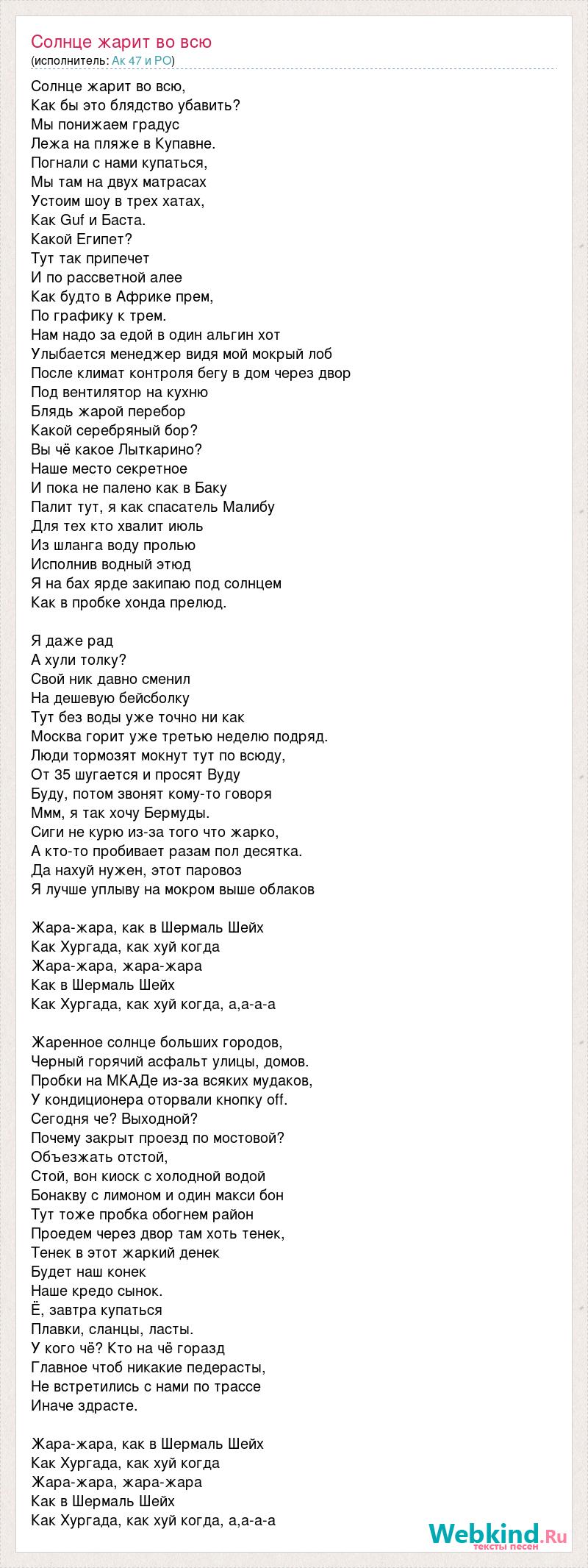 Солнце жарит во всю, Как бы это блядство убавить? Мы понижаем градус Лежа на пляже в Купавне. Погнали с нами купаться, Мы там на двух матрасах Устоим шоу в трех хатах, Как Guf и Баста. Какой Египет? Тут так припечет И по рассветной алее Как будто в Африке прем, По графику к трем. Нам надо за едой в один альгин хот Улыбается менеджер видя мой мокрый лоб После климат контроля бегу в дом через двор Под вентилятор на кухню Блядь жарой перебор Какой серебряный бор? Вы чё какое Лыткарино? Наше место секретное И пока не палено как в Баку Палит тут, я как спасатель Малибу Для тех кто хвалит июль Из шланга воду пролью Исполнив водный этюд Я на бах ярде закипаю под солнцем Как в пробке хонда прелюд. Я даже рад А хули толку? Свой ник давно сменил На дешевую бейсболку Тут без воды уже точно ни как Москва горит уже третью неделю подряд. Люди тормозят мокнут тут по всюду, От 35 шугается и просят Вуду Буду, потом звонят кому-то говоря Ммм, я так хочу Бермуды. Сиги не курю из-за того что жарко, А кто-то пробивает разам пол десятка. Да нахуй нужен, этот паровоз Я лучше уплыву на мокром выше облаков Жара-жара, как в Шермаль Шейх Как Хургада, как хуй когда Жара-жара, жара-жара Как в Шермаль Шейх Как Хургада, как хуй когда, а,а-а-а Жаренное солнце больших городов, Черный горячий асфальт улицы, домов. Пробки на МКАДе из-за всяких мудаков, У кондиционера оторвали кнопку оff. Сегодня че? Выходной? Почему закрыт проезд по мостовой? Объезжать отстой, Стой, вон киоск с холодной водой Бонакву с лимоном и один макси бон Тут тоже пробка обогнем район Проедем через двор там хоть тенек, Тенек в этот жаркий денек Будет наш конек Наше кредо сынок. Ё, завтра купаться Плавки, сланцы, ласты. У кого чё? Кто на чё горазд Главное чтоб никакие педерасты, Не встретились с нами по трассе Иначе здрасте. Жара-жара, как в Шермаль Шейх Как Хургада, как хуй когда Жара-жара, жара-жара Как в Шермаль Шейх Как Хургада, как хуй когда, а,а-а-а